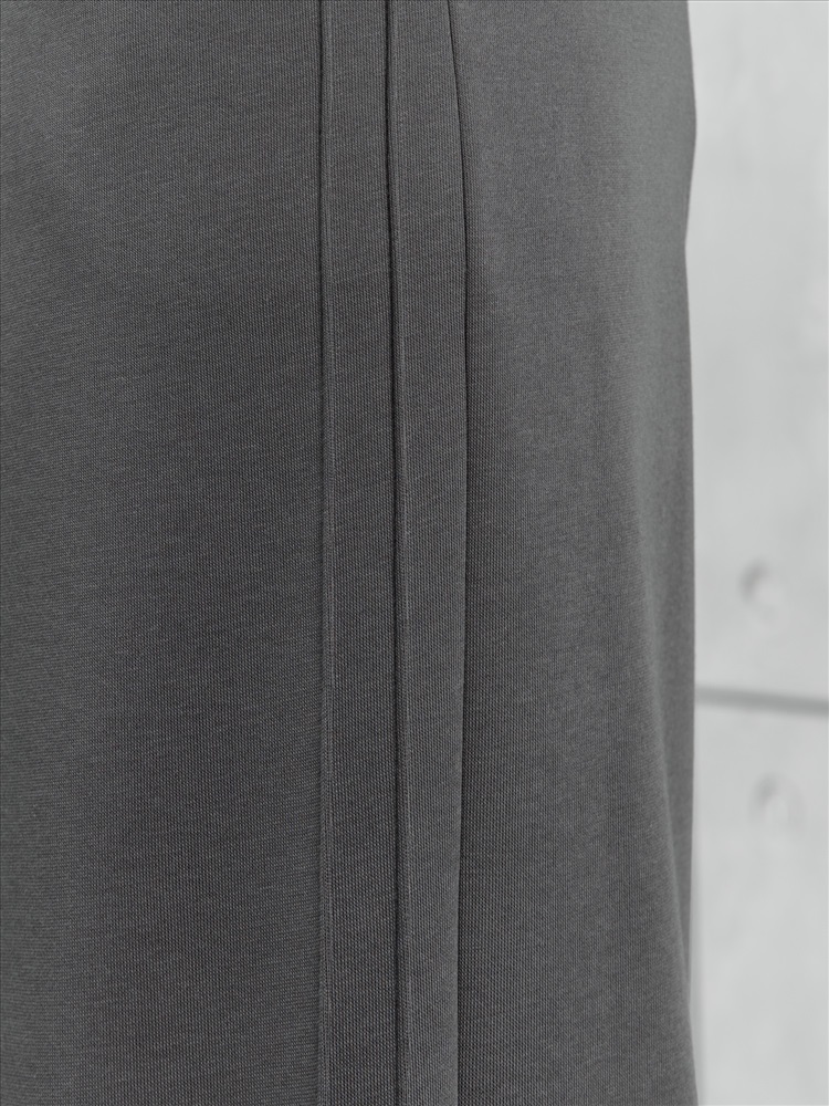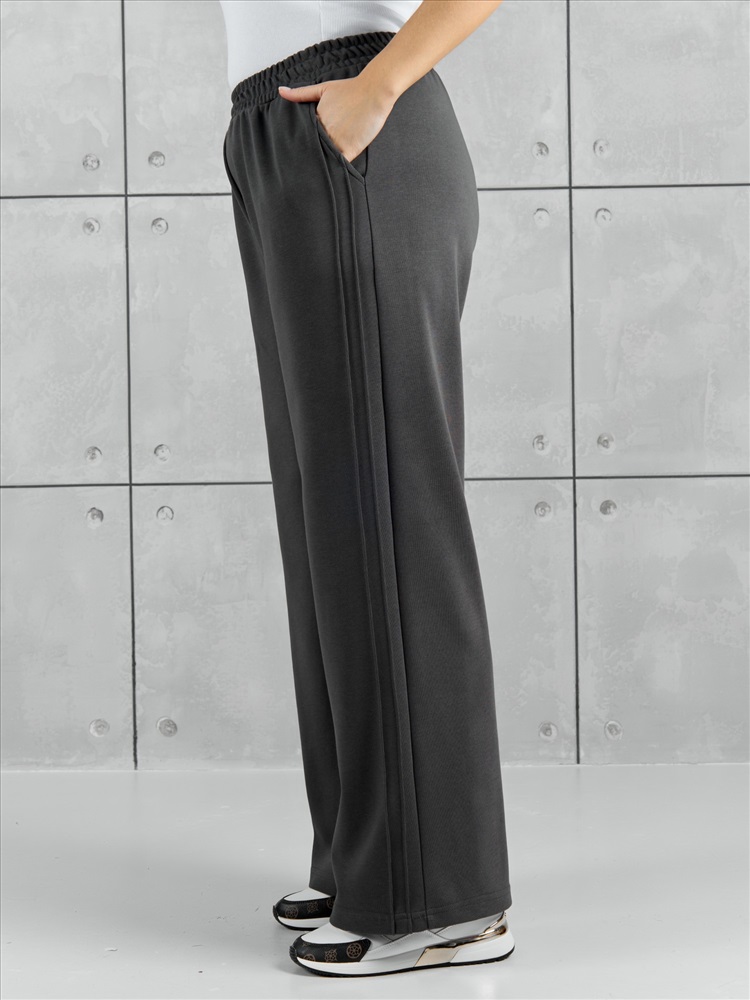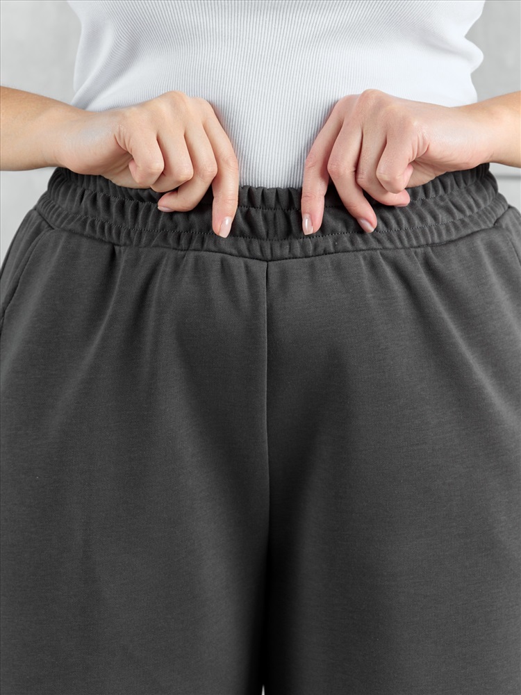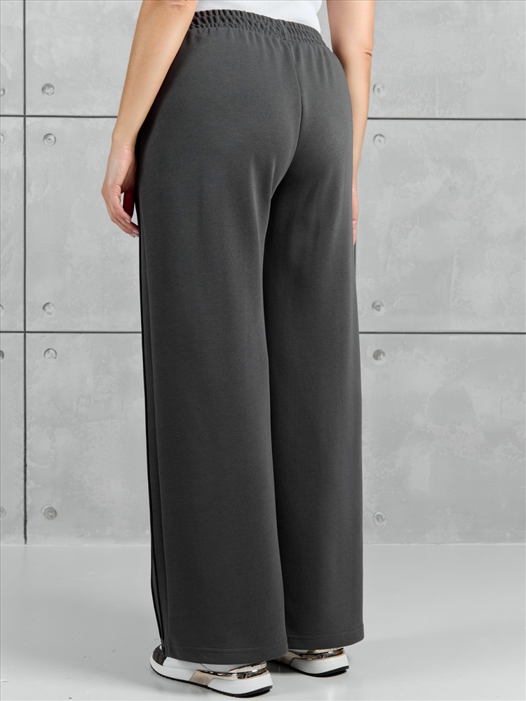 Брюки женские из гладкокрашенного трикотажного полотна «лининг» прямого кроя, длинные, свободные, расширенные к низу, на поясе с эластичной тесьмой внутри, карманами в боковых швах. Передние половины застрочены двумя параллельными линиями, смещенными к боковым швам.
