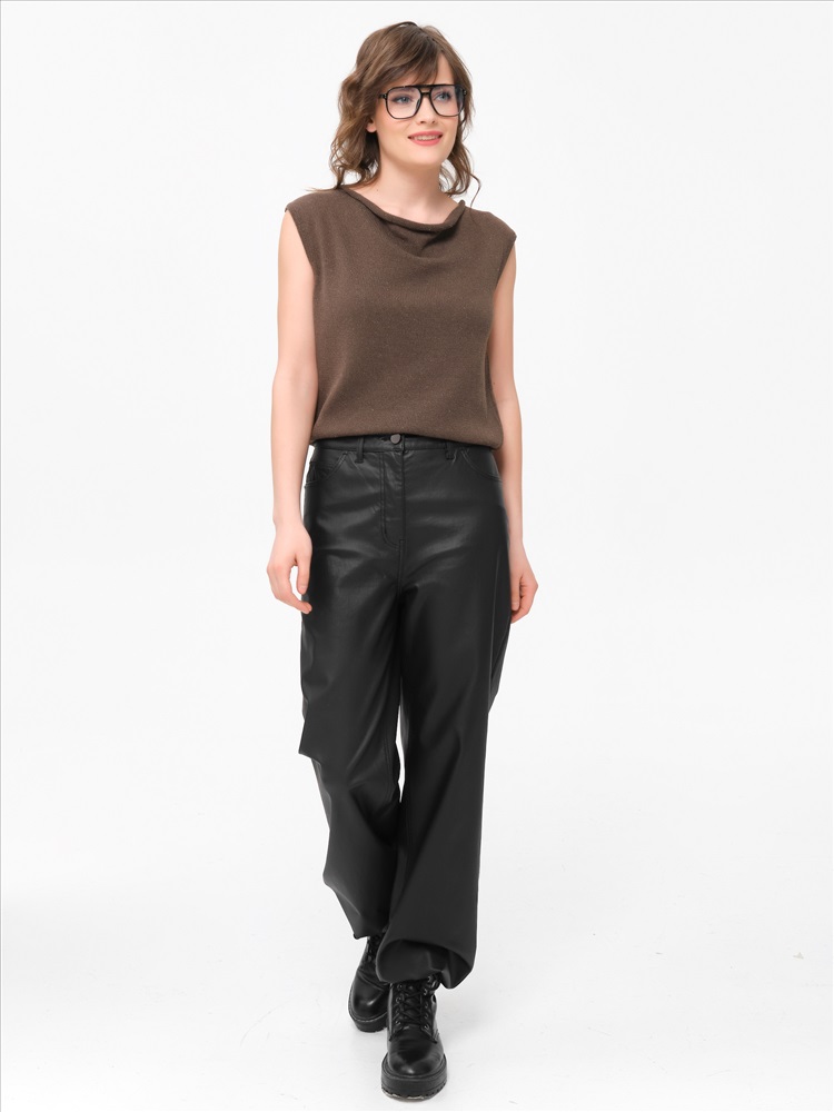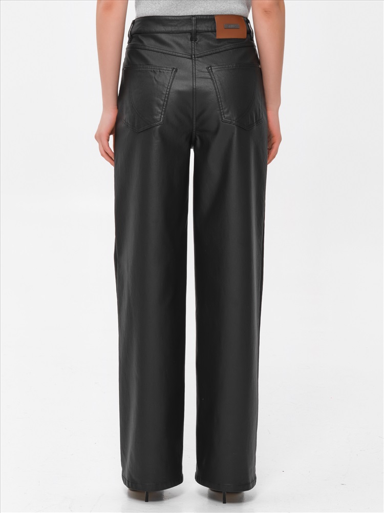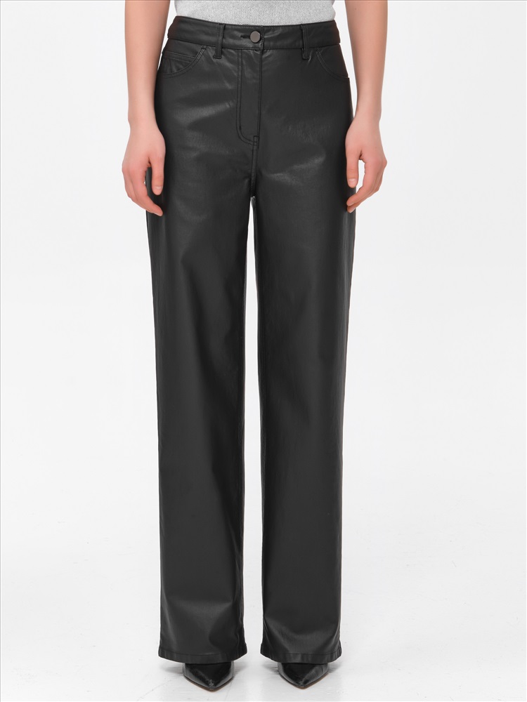 Брюки чёрные с покрытием под кожу от фабрики PRIZ. Пояс прямого силуэта. Пояс подкройной, со шлёвками. Застёжка на молнию и пуговицу на поясе. Спереди карманы в подрезных бочках. Сзади кокетки и фигурные накладные карманы. Брюки декорированы хольнитенами и отделочными строчками. Внимание! После стирки изделие деформируется. После полного высыхания форма изделия восстанавливается. Замечательный вариант для создания эффектного образа., Оттенок цвета может незначительно отличаться от фото., Ожидание отправки (рабочих дней): 7, Длина: в росте 164: в 42 р-ре - 111 см, в 54 р - 112 см., Размер модели: 44., Рост модели: 174 см., Состав:, Вискоза 79%, Нейлон 18%, Эластан 3%