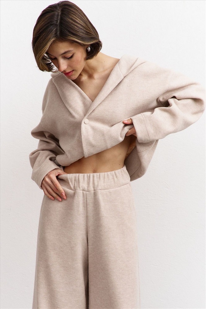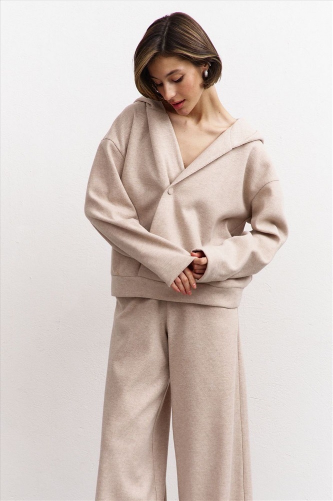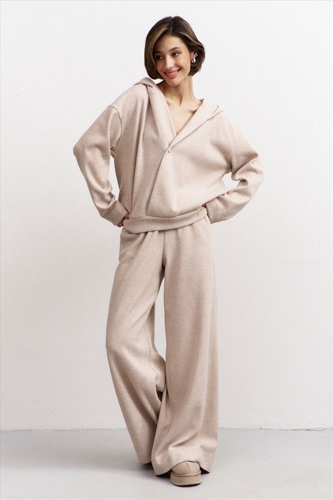 Комплект (джемпер + брюки). Джемпер свободного кроя на запах: - спущенная линия плеча - горловина с двойным объемным капюшоном - застежка на кнопку - рукава втачные Брюки палаццо: - притачной пояс на резинке - карманы с наклонным входом