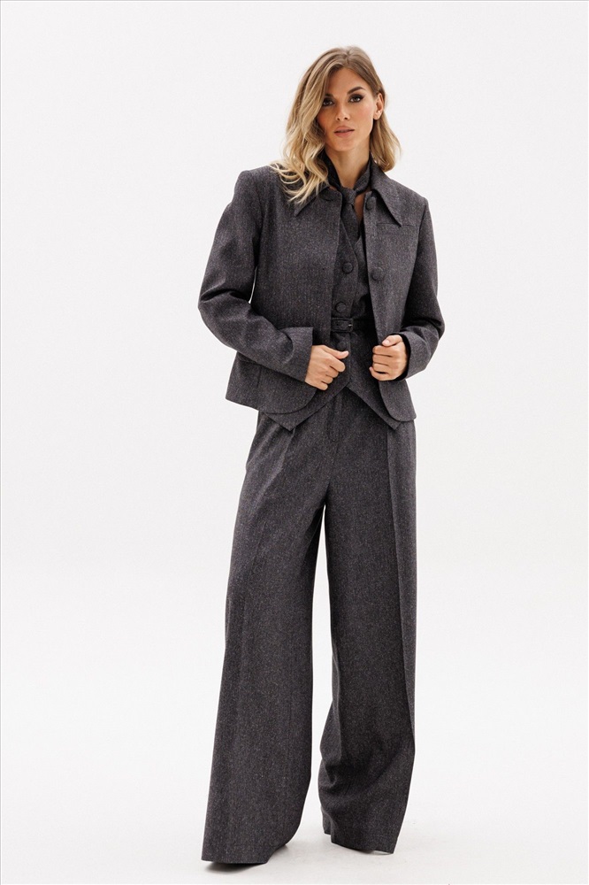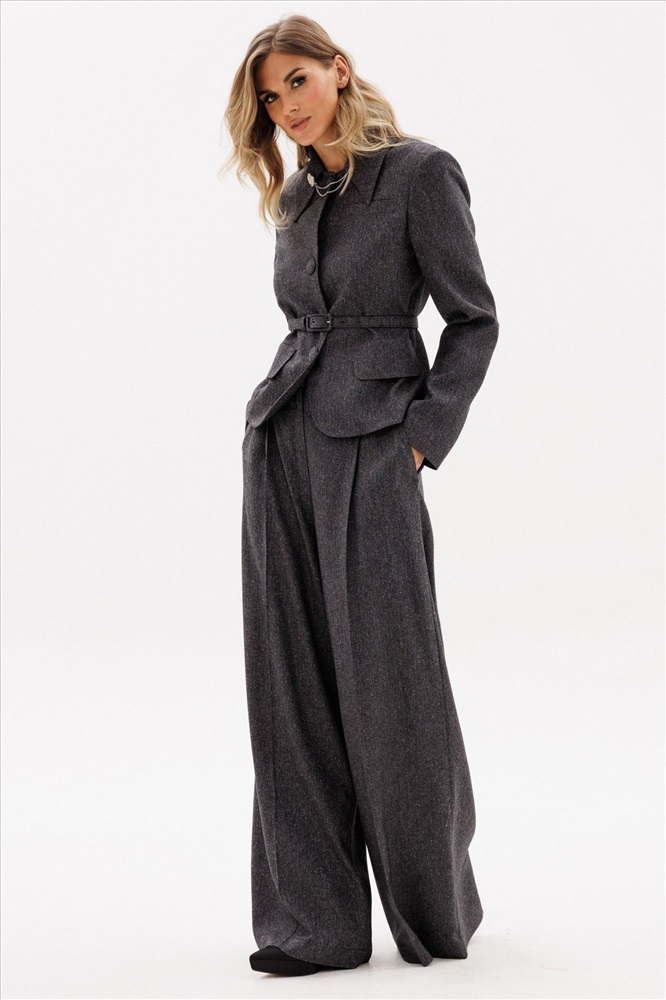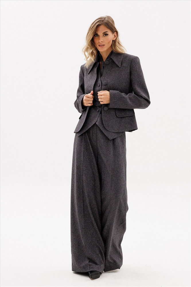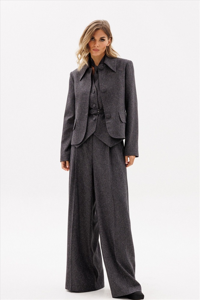 Брюки-палаццо выполнены из костюмной ткани меланж. Брюки на притачном поясе, длиной в пол, расширенные к низу. Спереди складки и боковые карманы с наклонным входом. Застежка спереди на молнию с гульфиком и пуговицу. На задних частях обработаны талиевые вытачки. Длина брюк: р. 44-48 - 111 см, р. 50-54 - 112 см 44 46 48 50 52 54 Длина сбоку 111 111 111 112 112 112 Объем по талии 73 77 81 85 89 93 Объем по бедрам 100 104 108 112 116 120 Ширина пояса 3,8 3,8 3,8 3,8 3,8 3,8