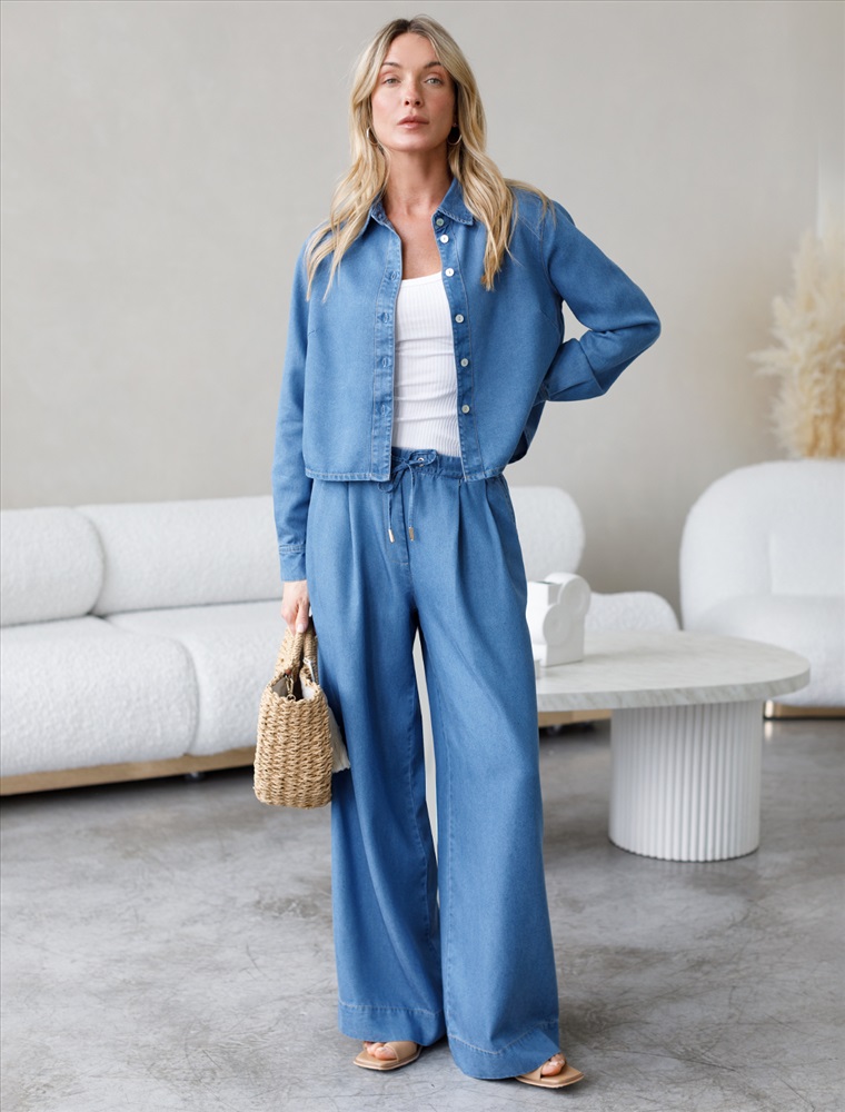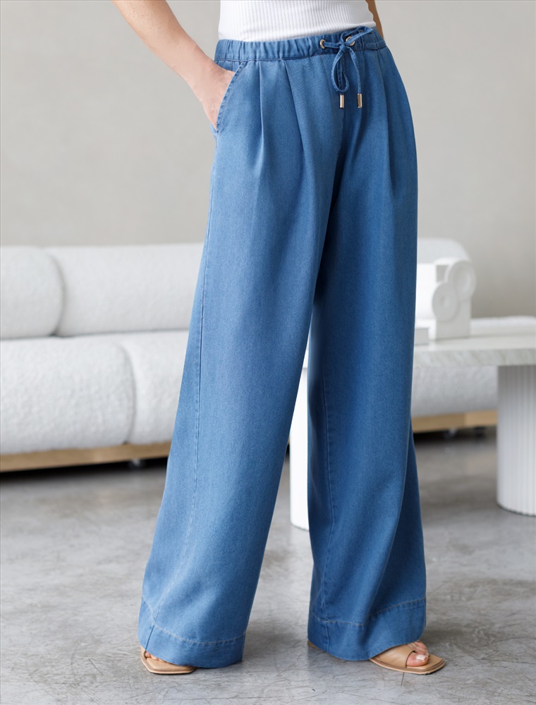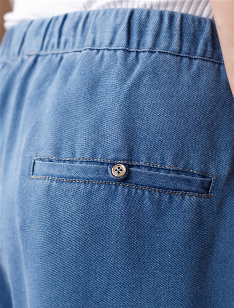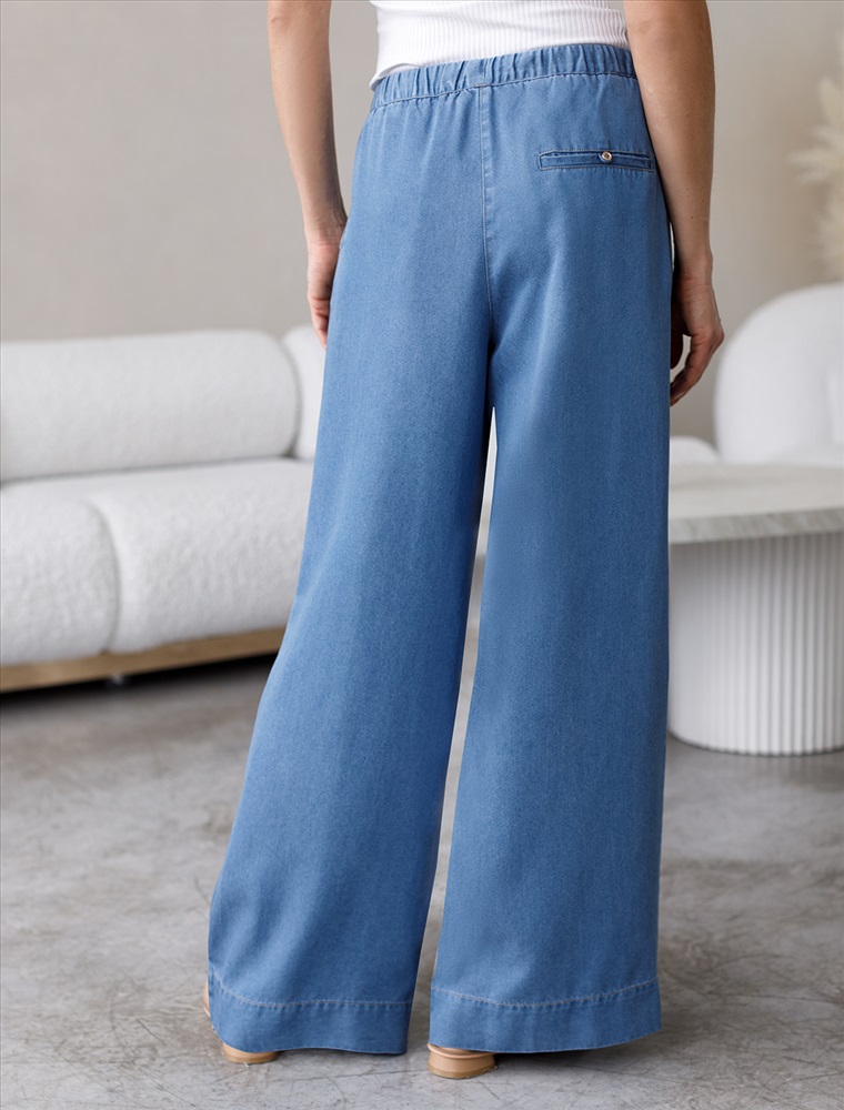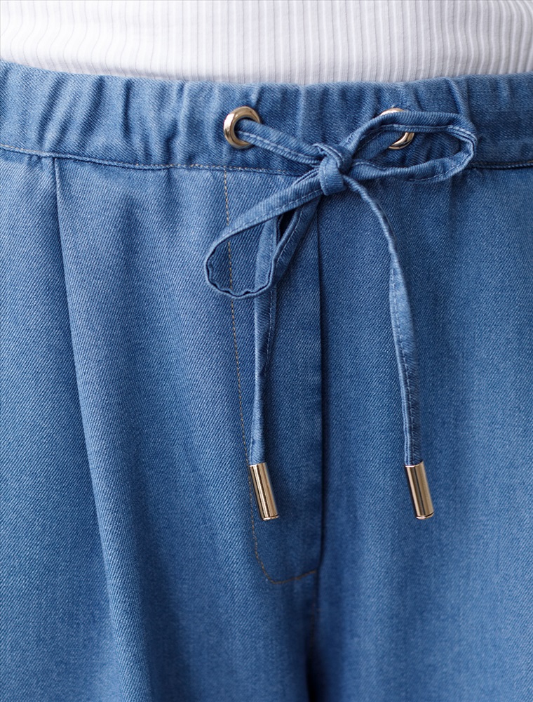 Брюки свободного кроя выполнены из лиоцелла. Модель с эластичным поясом на резинке дополнена регулируемым шнуром из основного полотна, боковыми карманами и одним карманом сзади. Ткань с характерным атласным блеском полностью имитирует обычный деним, но в тоже время намного более мягкая, плавно струится по телу, хорошо драпируется и охлаждает кожу в жаркое время года. Изделие сочетается в костюме с блузкой D59.017