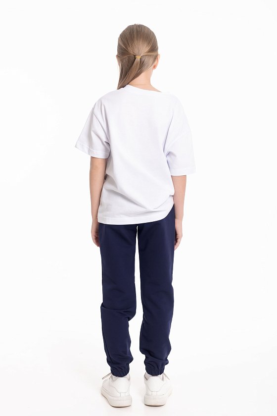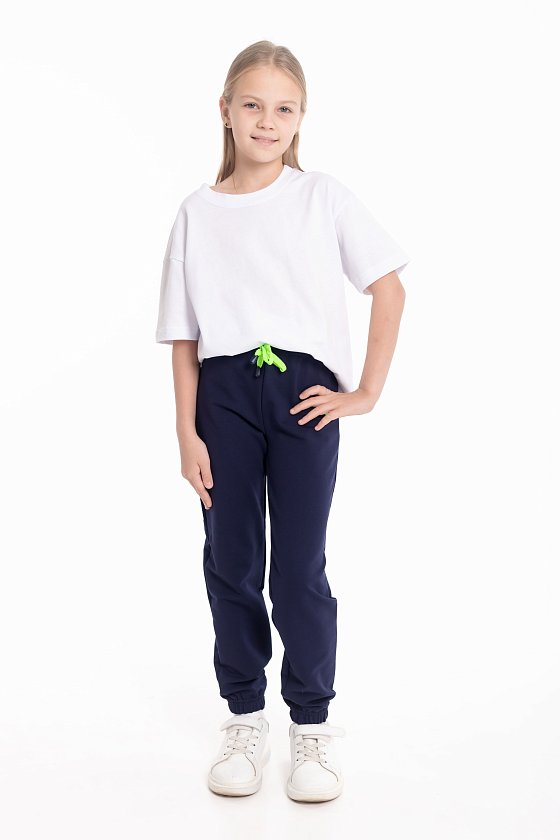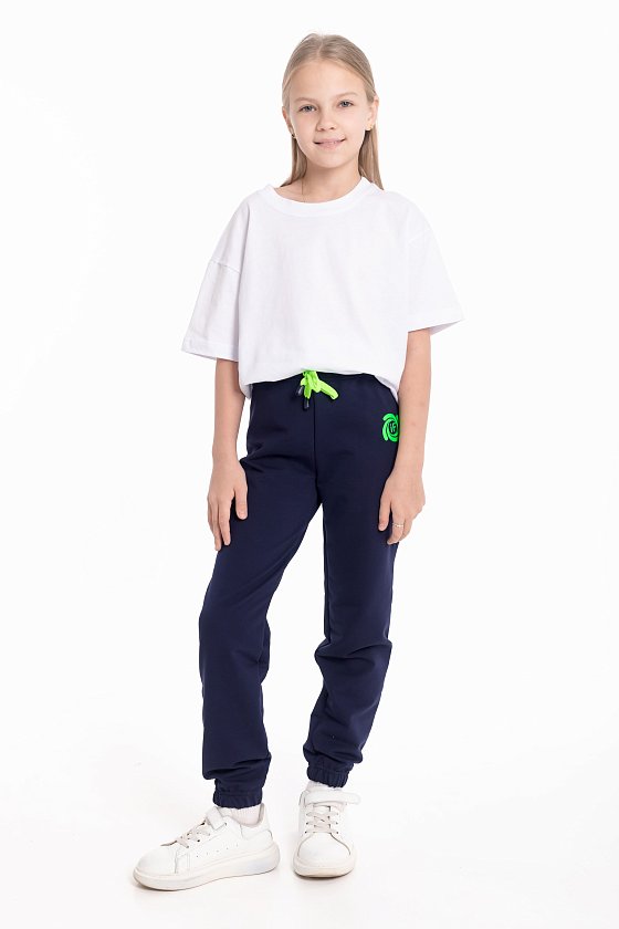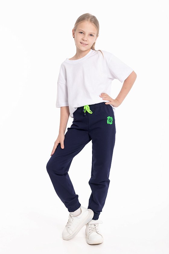 Брюки выполнены из однотонного футера с лайкрой. Пояс и низ брюк на резинке. В поясе через люверсы проложен декоративный шнур, с левой стороны на брюках нанесён термопринт.