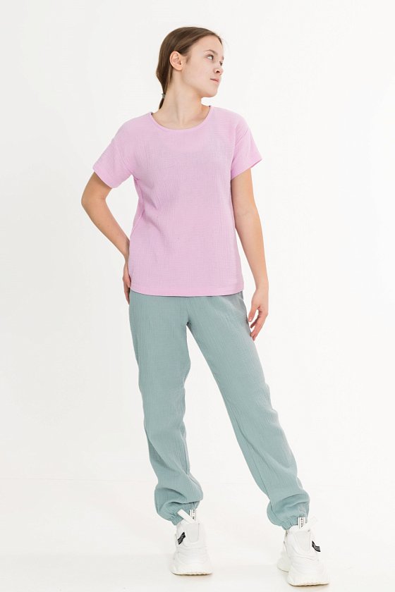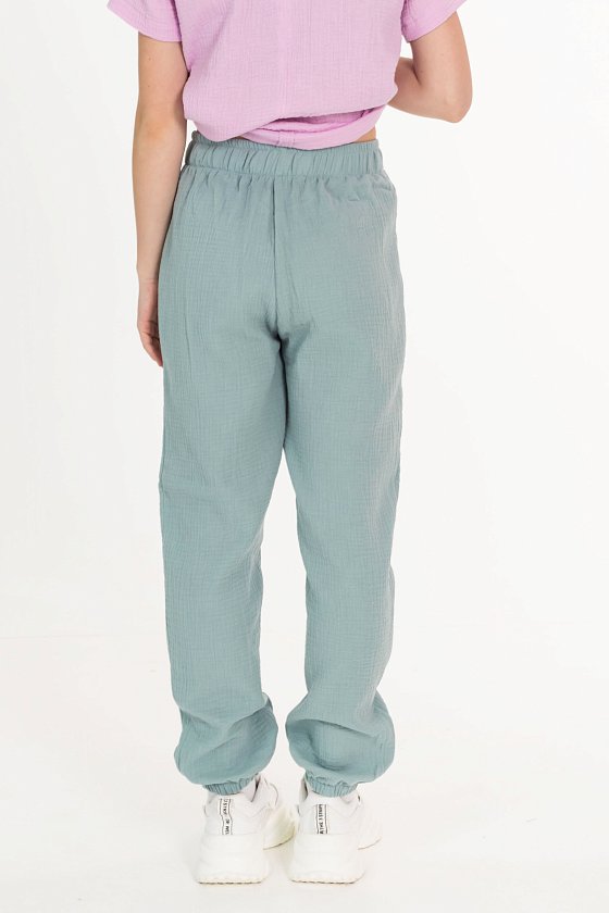 Детские летние брюки выполнены из муслина. Пояс и низ брюк на резинке.