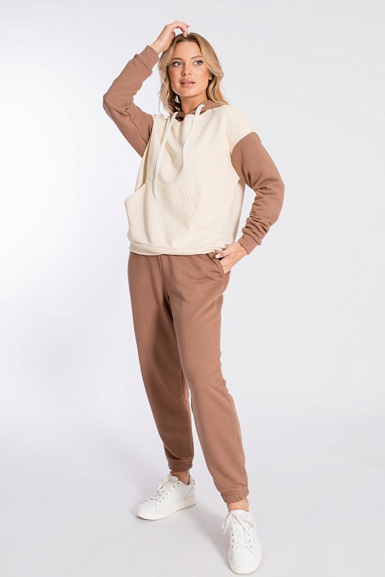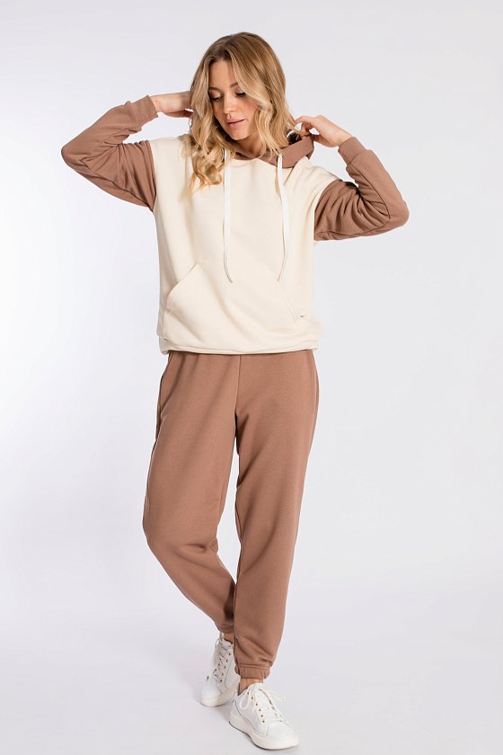 Брюки выполнены из однотонного футера трёхнитки (воздушка), с притачным поясом и резинкой по низу. По бокам размещены карманы.