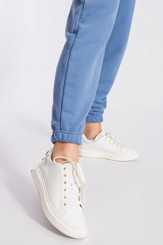 Брюки выполнены из однотонного футера трёхнитки (воздушка), с притачным поясом и резинкой по низу. По бокам размещены карманы.