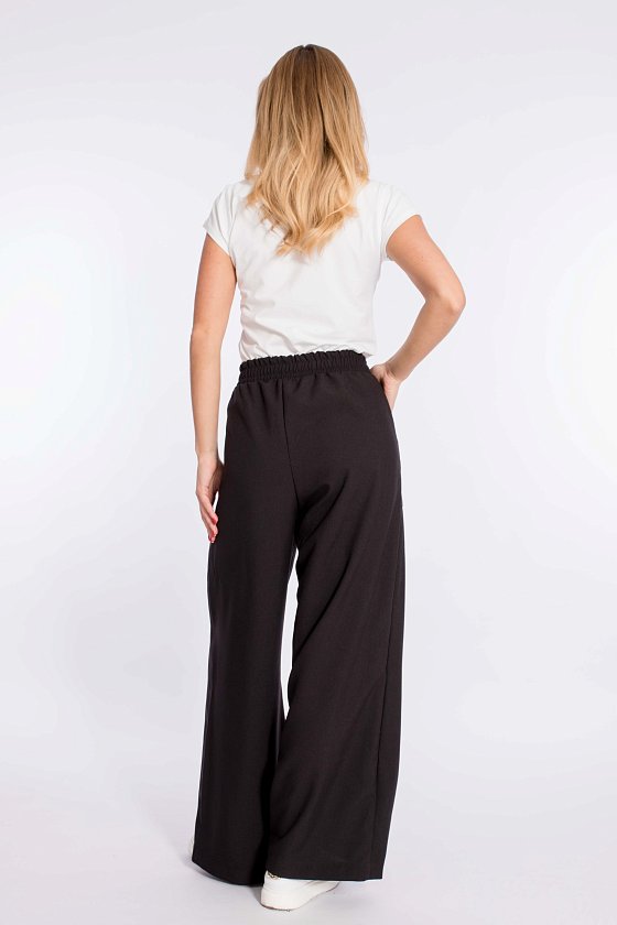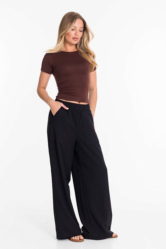 Женские брюки свободного силуэта выполнены из искусственного льна. Спереди настрочены карманы, пояс на резине.