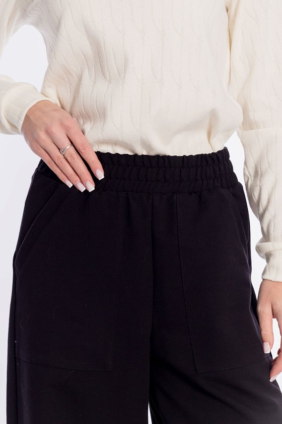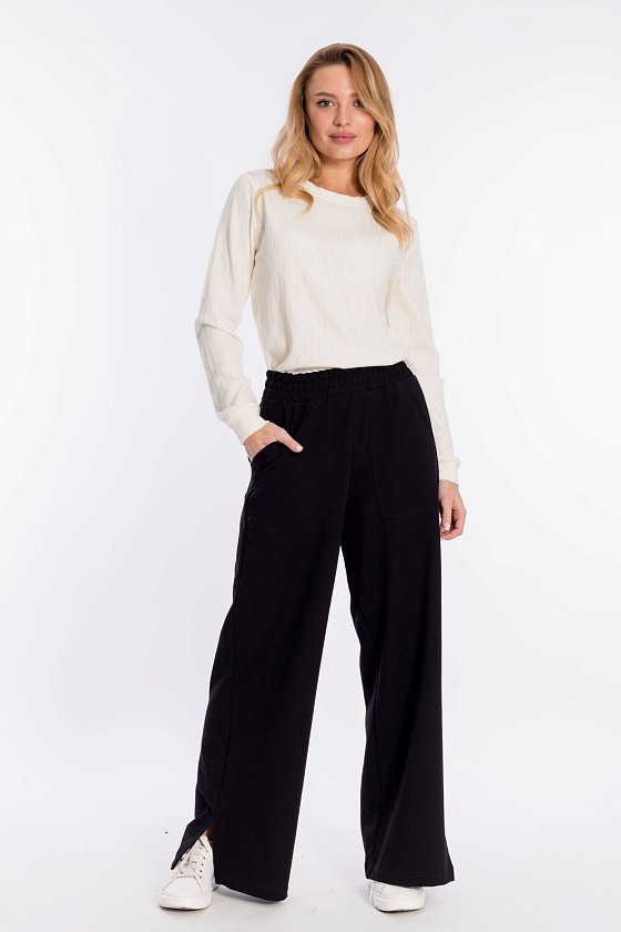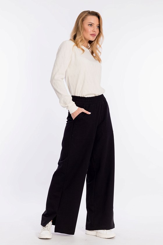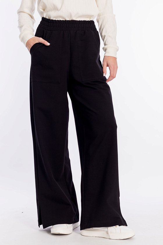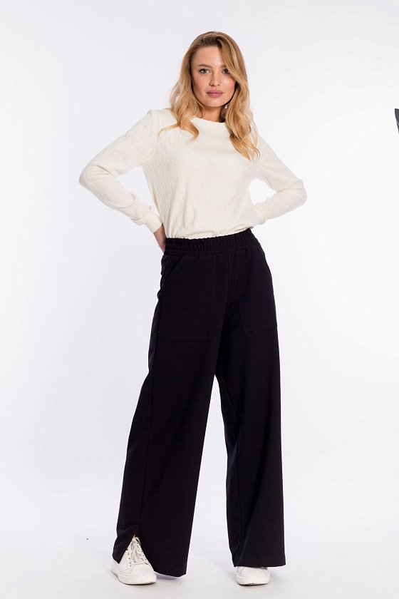 Женские брюки свободного силуэта выполнены из футр петли с лайкрой. Спереди настрочены карманы, пояс на резине. Внизу брюк, по бокам, расположены декоративные разрезы.