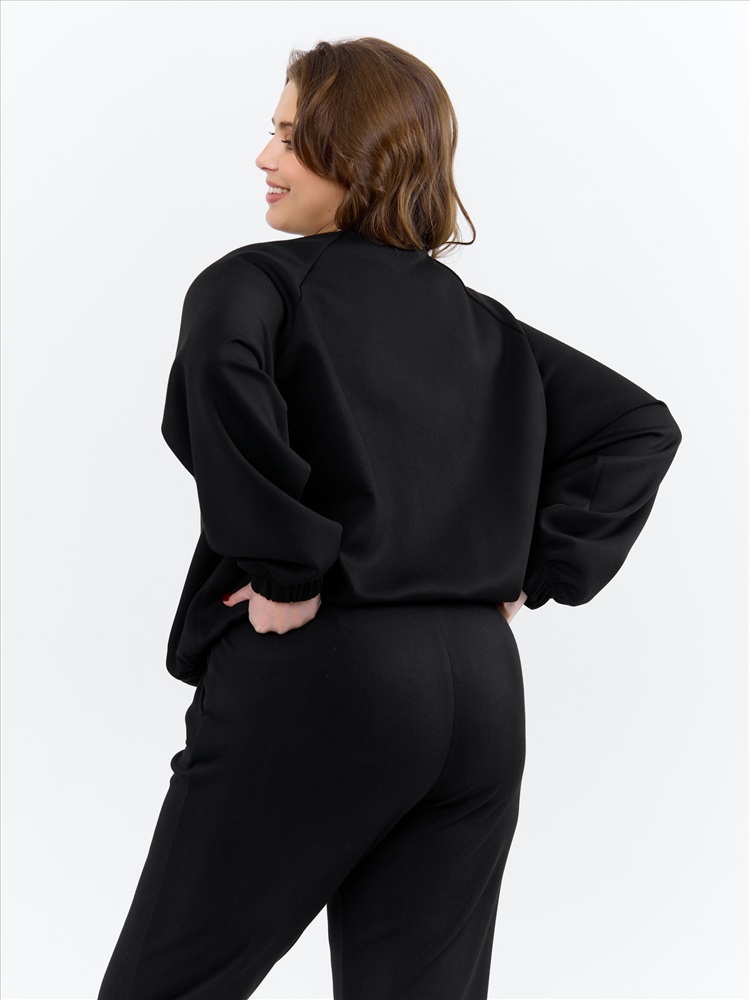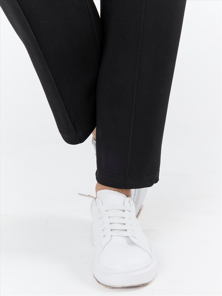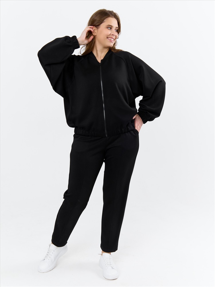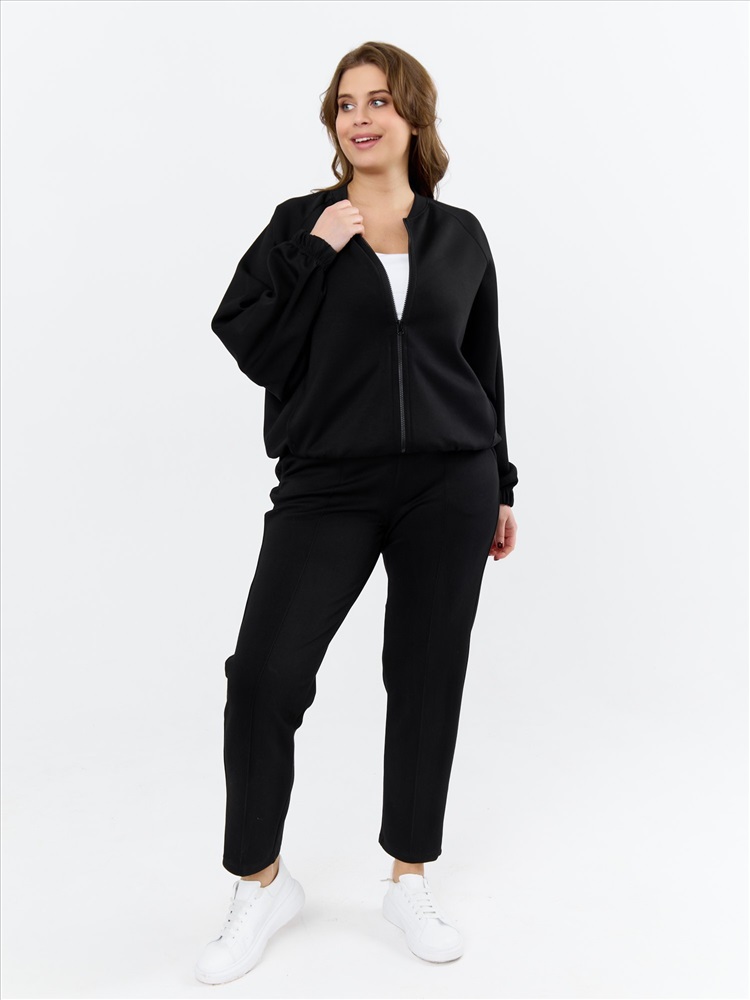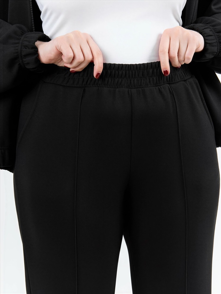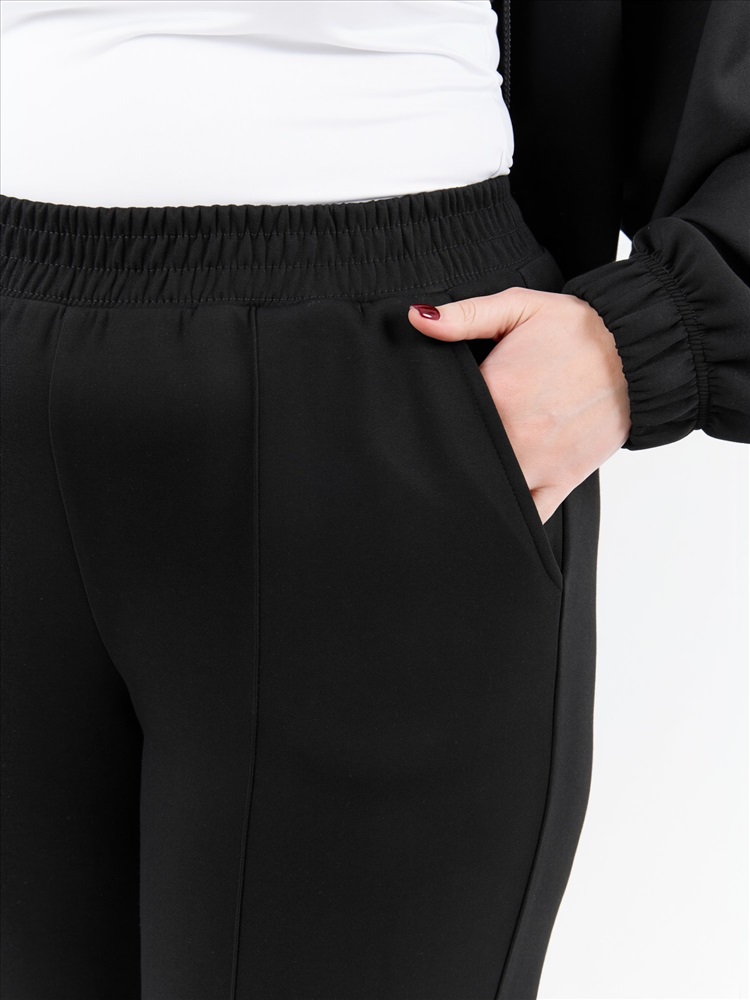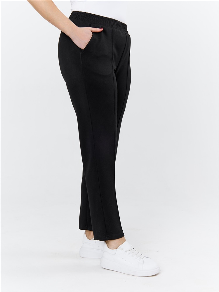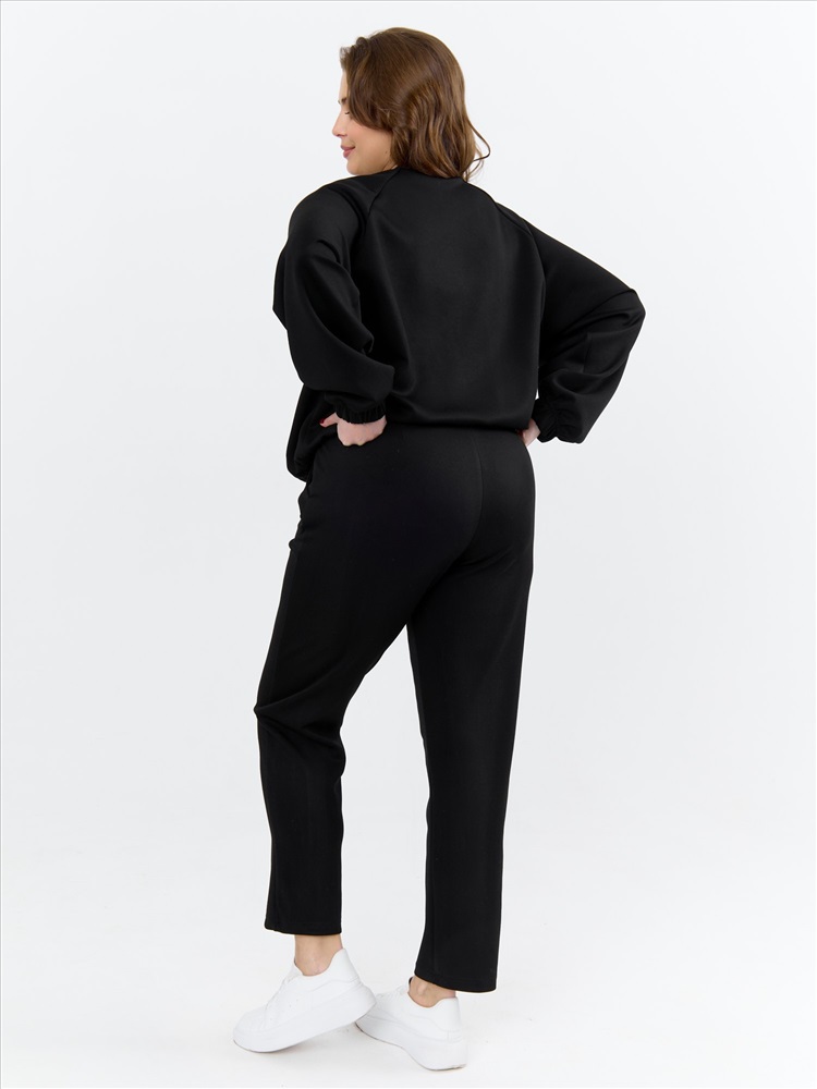 Брюки женские из трикотажного гладкокрашенного полотна «скуба», длинные, полуприлегающего силуэта, на притачном поясе с эластичной тесьмой внутри и карманами в боковых швах. Передние половины застрочены по центральным линиям, на задних половинах обработаны две вытачки в области талии.