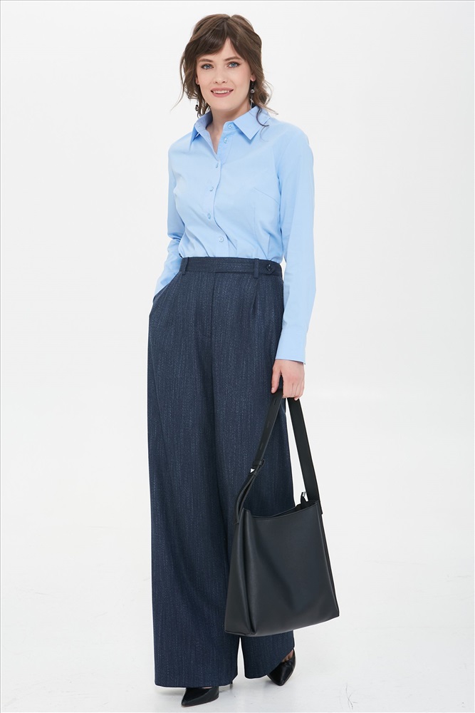 Брюки прямые тёмно-синие с карманами от торгового дома Priz., Модель, на притачном поясе, со шлёвками. Выполнены из текстильного полотна. Сзади пояс присборен на резину. Спереди защипы и карманы в подрезных бочках. Застёжка на молнию и пату с пуговицей. Сзади прорезной карман в рамку с клапаном и застёжкой на пуговицу. Ремень в комплект не входит. Прекрасный выбор для городских модниц., Оттенок цвета может незначительно отличаться от фото., Ожидание отправки (рабочих дней): 7, Длина: в росте 164: в 42 р-ре - 112 см, в 54 р-ре - 113 см., Размер модели: 44., Рост модели: 164 см., Состав:, Полиэстер 63%, Вискоза 35%, Эластан 2%, Тип ткани:, Текстиль