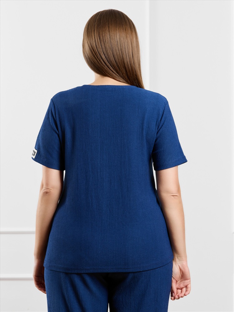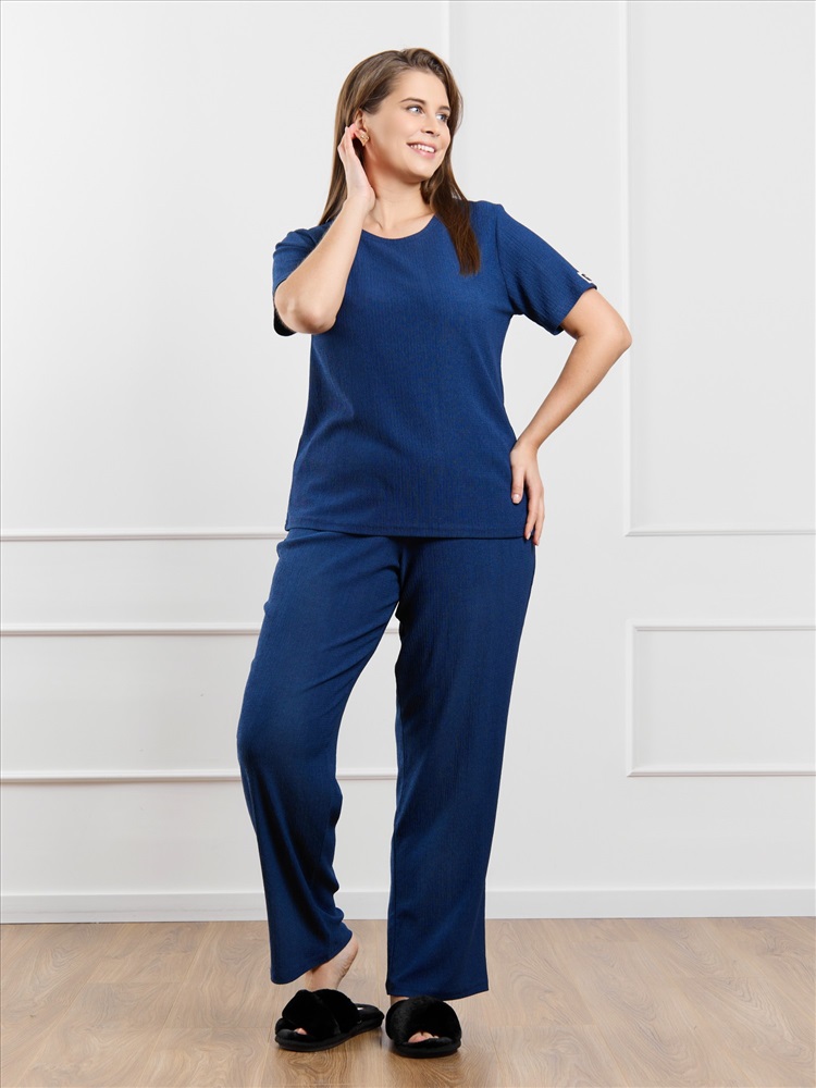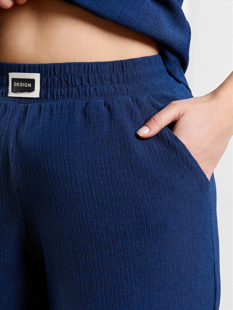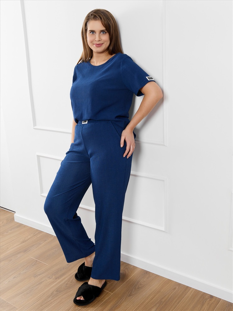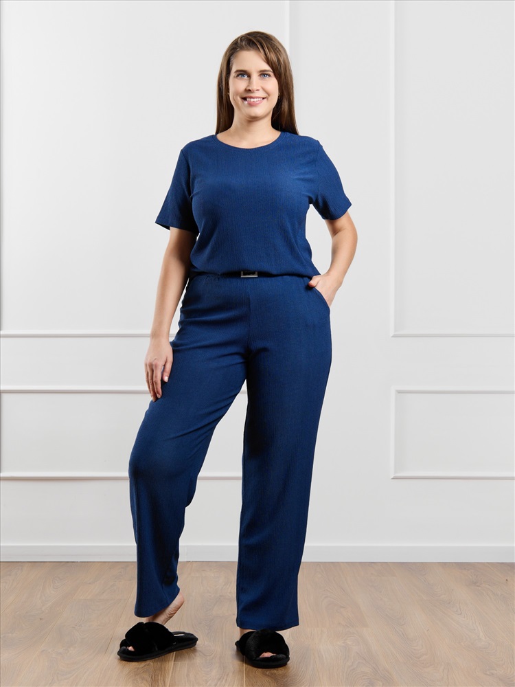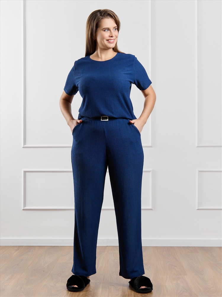 Ткань: Фактурный трикотаж Брюки женские из гладкокрашенного трикотажного полотна «бурумчук», свободного покроя, с карманами в боковых швах, на притачном поясе с эластичной тесьмой внутри.