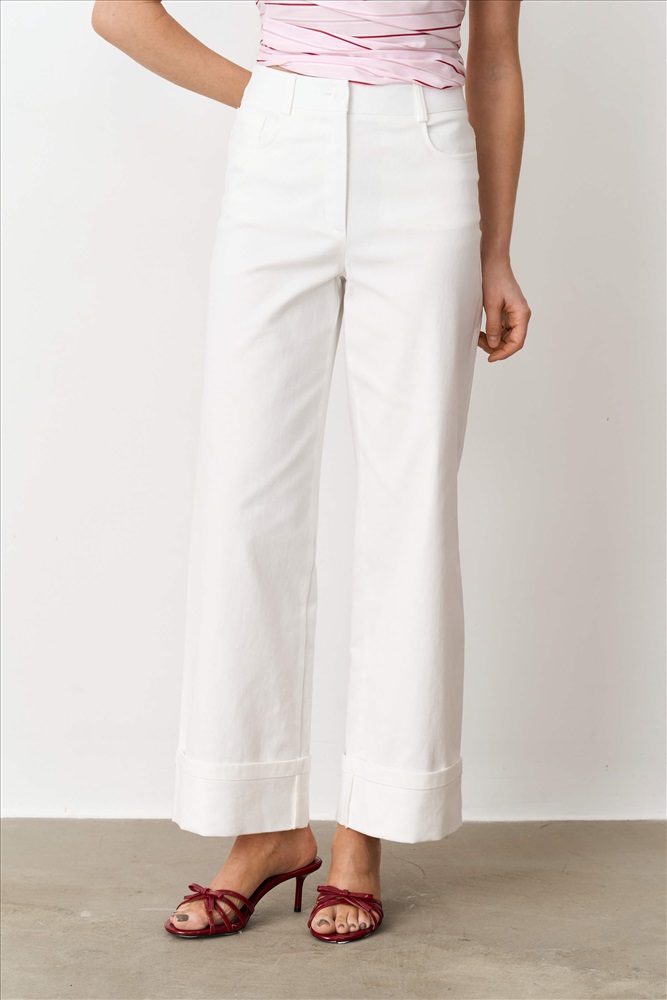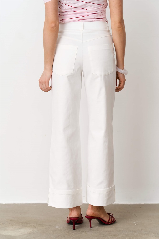 Состав: 95% хлопок 5% эластан Длина: 100 см. Цветовая гамма: Молочный Силуэт: Прямой Принт: Нет Коллекция: Лето #4 Джинсы с отворотами по низу из мягкого денима. Модель прямого силуэта. Притачной пояс со шлевками. По переду боковые карманы, застежка-гульфик. По спинке кокетка с накладными карманами. Низ оформлен широкими отворотами, зафиксированными закрепкой. Комментарии к товару