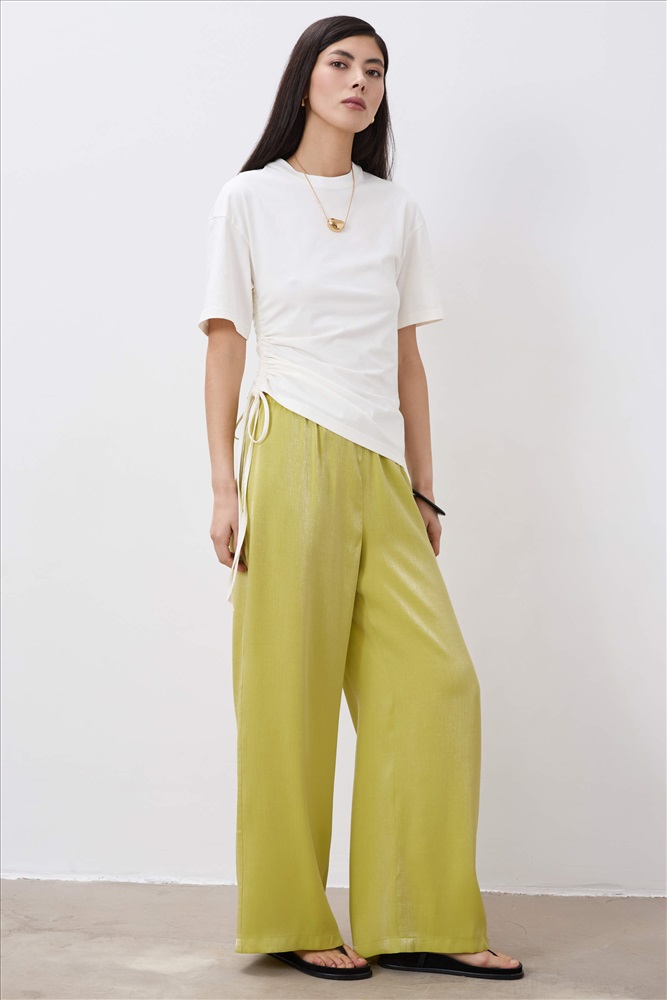 Яркие летние брюки из льняного полотна. Модель прямого силуэта с застроченными стрелками. По переду боковые карманы и пояс с декоративной завязкой. По спинке пояс на резинке.