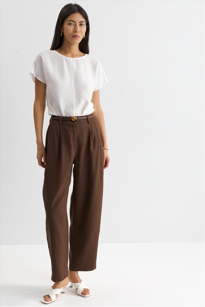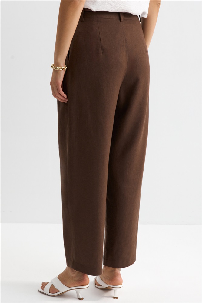 Состав: 70% Лен 30% Вискоза Цветовая гамма: Шоколад Силуэт: Свободный Принт: Нет Коллекция: Лето #3 Брюки трендового силуэта barrel из льняного полотна. Модель свободного, зауженного к низу силуэта. По переду защипы, боковые карманы, гульфик. Застежка на молнию и пуговицу. Комментарии к товару