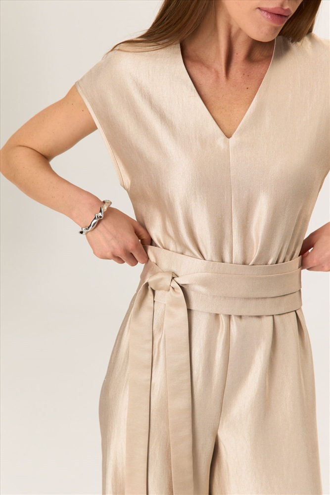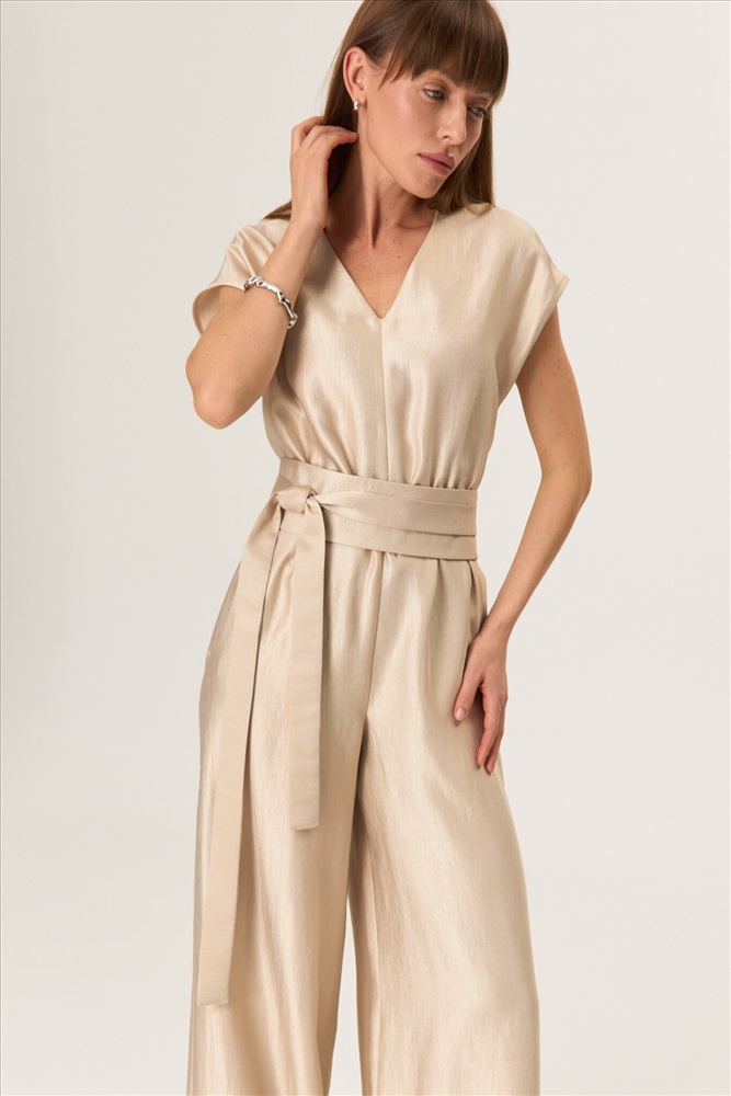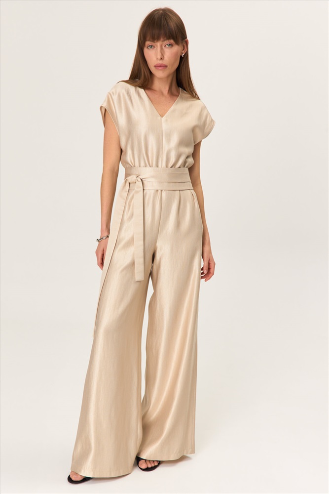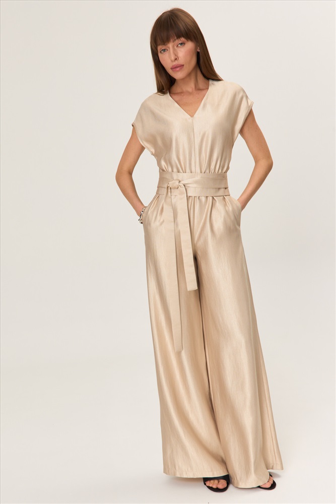 Состав: 85% Вискоза 15% Нейлон Длина: 155 см. Цветовая гамма: Бежевый Силуэт: Свободный Принт: Нет Коллекция: Лето #5 Комбинезон свободного силуэта со спущенным плечом из вискозы с деликатным блеском. По переду горловина оформлена V- образно. Талия фиксируется на эластичную резину. По спинке потайная молния. В комплекте пояс-кушак. Комментарии к товару