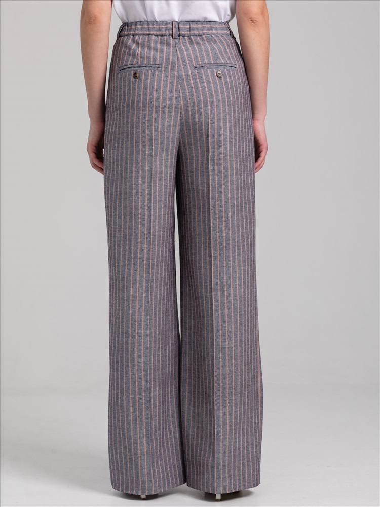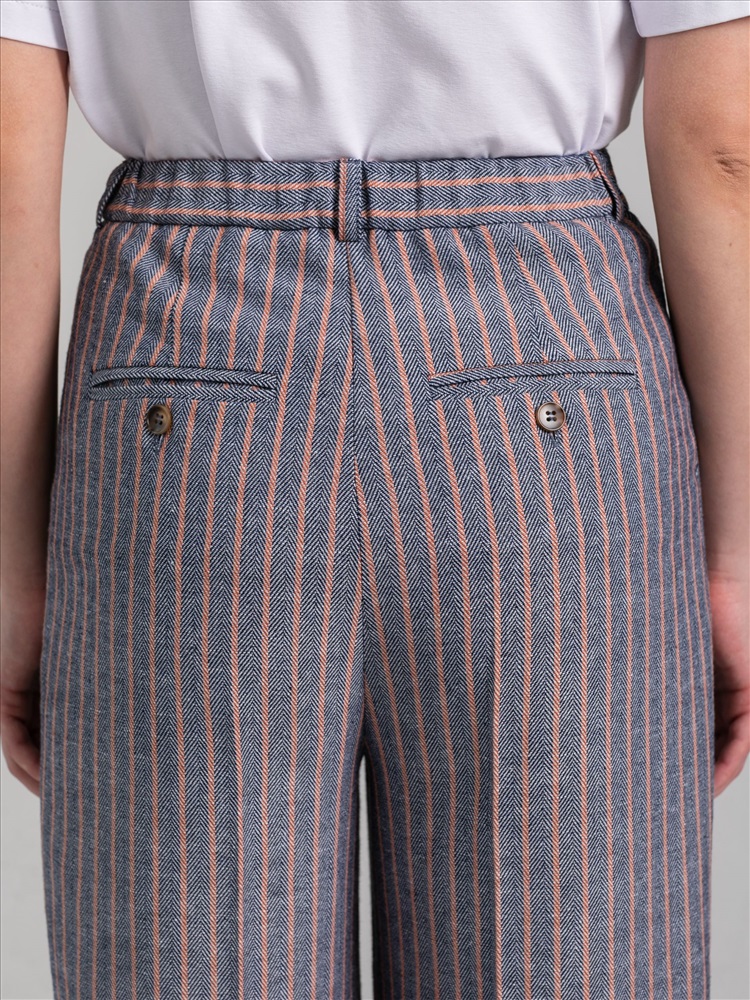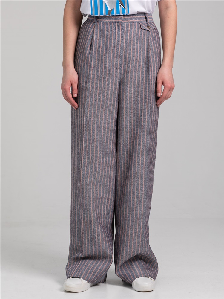 Брюки сине-серые в полоску от фабрики PRIZ, выполнены из текстильного полотна. Модель прямого силуэта, на притачном поясе, со шлёвками. Сзади пояс присборен на резину. Спереди защипы, карманы в подрезных бочках и декораитивный клапан, фиксированный пуговицей. Сзади прорезные карманы в рамку застёгиваются на пуговицу. Стильный вариант для повседневной носки., Оттенок цвета и расположение рисунка могут незначительно отличаться от фото., Ожидание отправки (рабочих дней): 7, Длина: в росте 164: в 42 р-ре - 111 см; в 54 р-ре - 112 см., Размер модели: 44., Рост модели: 174 см., Состав:, Хлопок 62%, Полиэстер 30%, Лён 8%, Тип ткани:, Текстиль