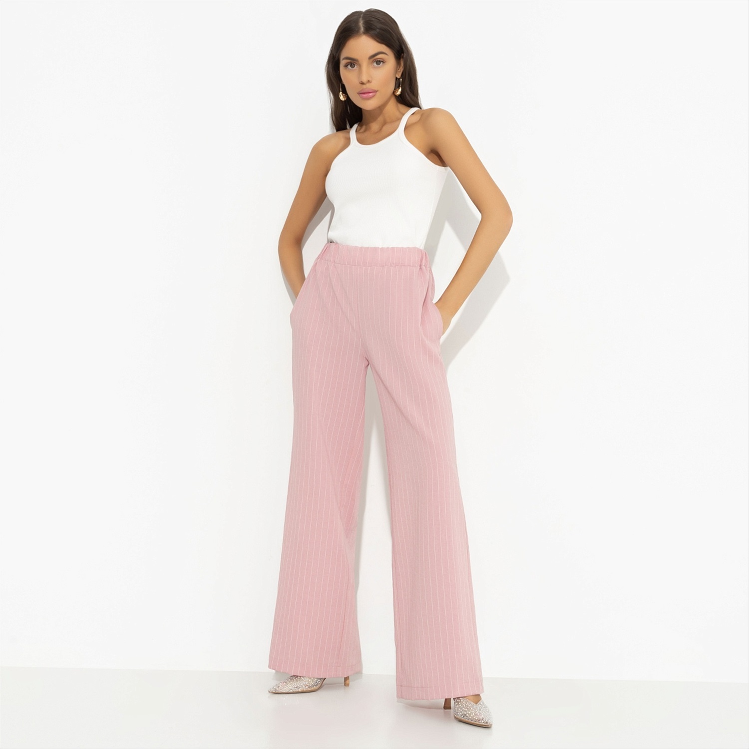 Зимой и летом, весной и осенью, в любую погоду и при любой модной повестке, брюки в розовом цвете будут актуальны. Нежность и элегантность выходят за пределы трендов, навсегда врезаясь в память окружающим. Брюки прямые в тонкую полоску. Посадка на талии. Пояс оформлен скрытой резинкой. Есть карманы.