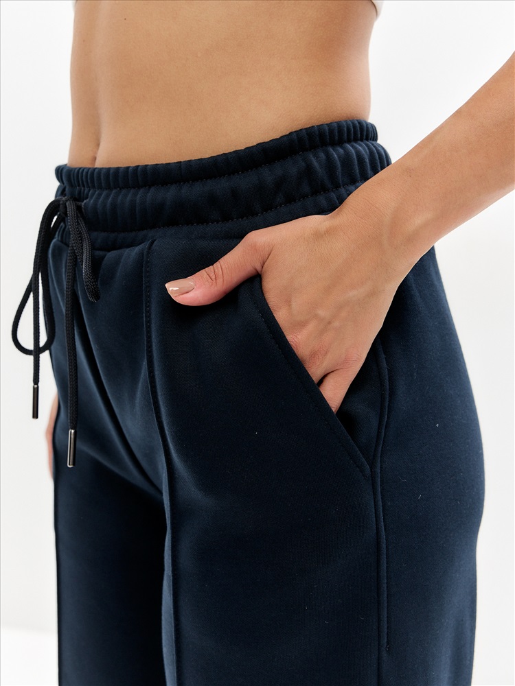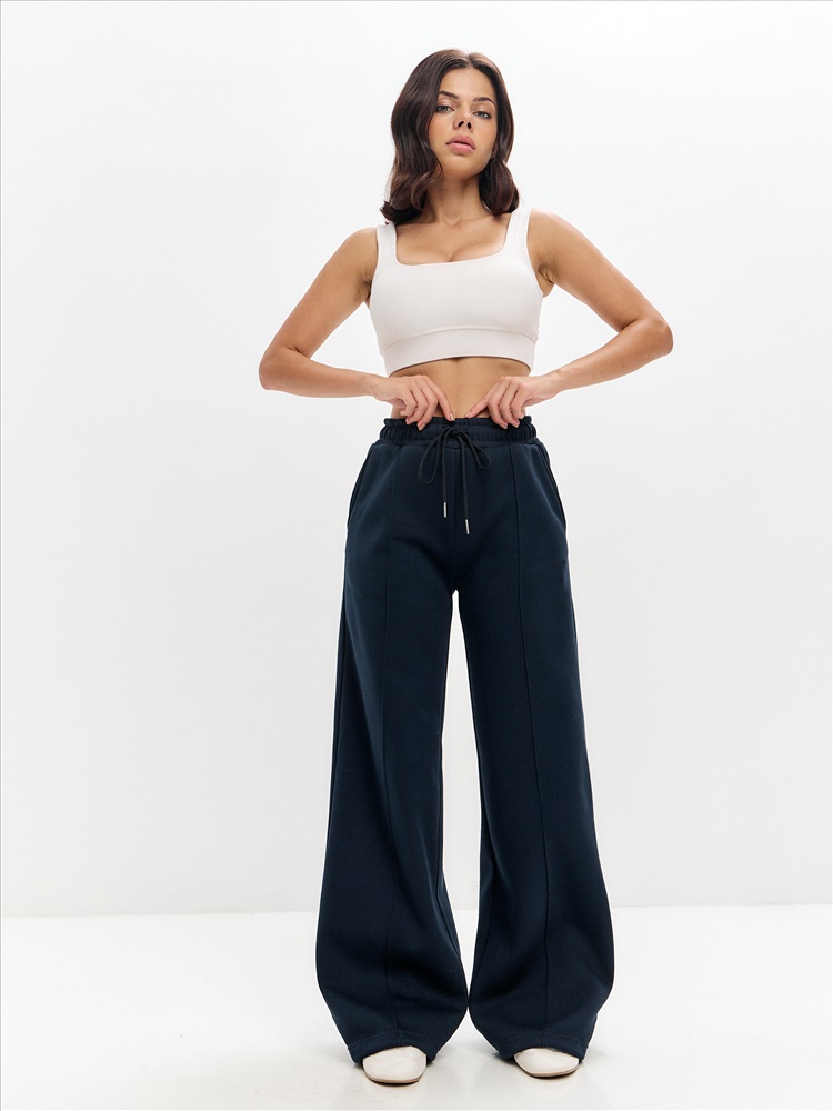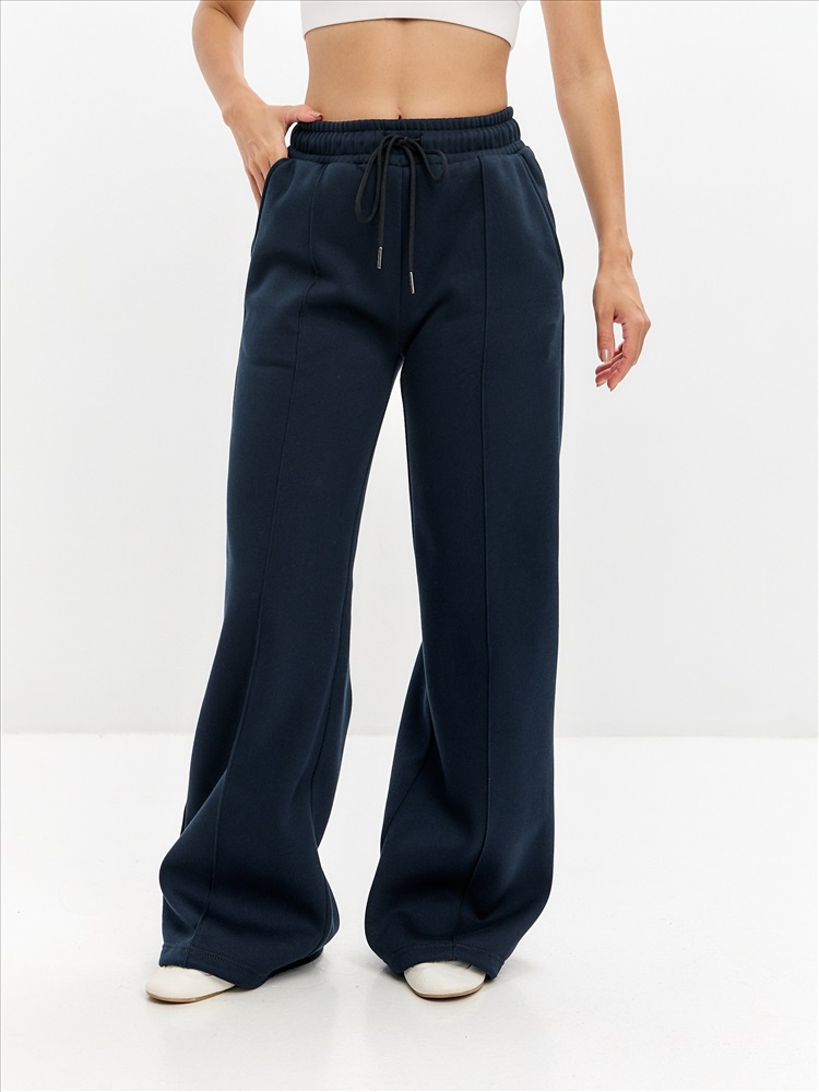 Женские артикул 22L-RR-1872 темно-синего цвета брюки палаццо изготовлены из хлопкового трикотажного полотна с изнаночным начесом. Широкие брючины можно трансформировать, собрав низ на эластичный шнур с помощью фиксатора. Удобные наклонные карманы выполнены в боковых подрезах. Пояс брюк широкий, по линии талии собран на эластичную резинку, длина пояса дополнительно регулируется шнуром.
