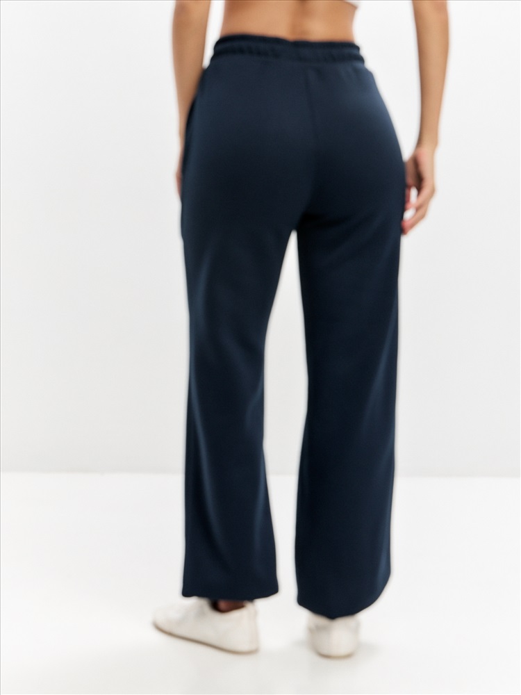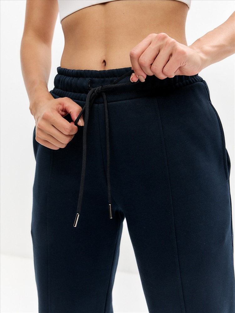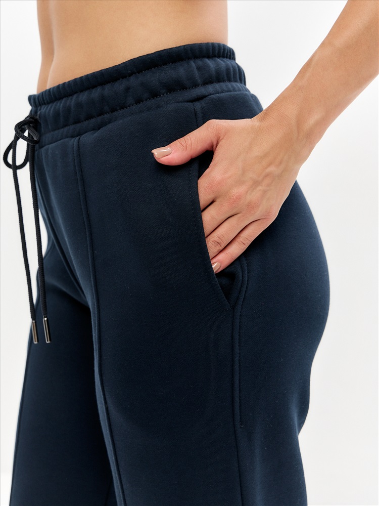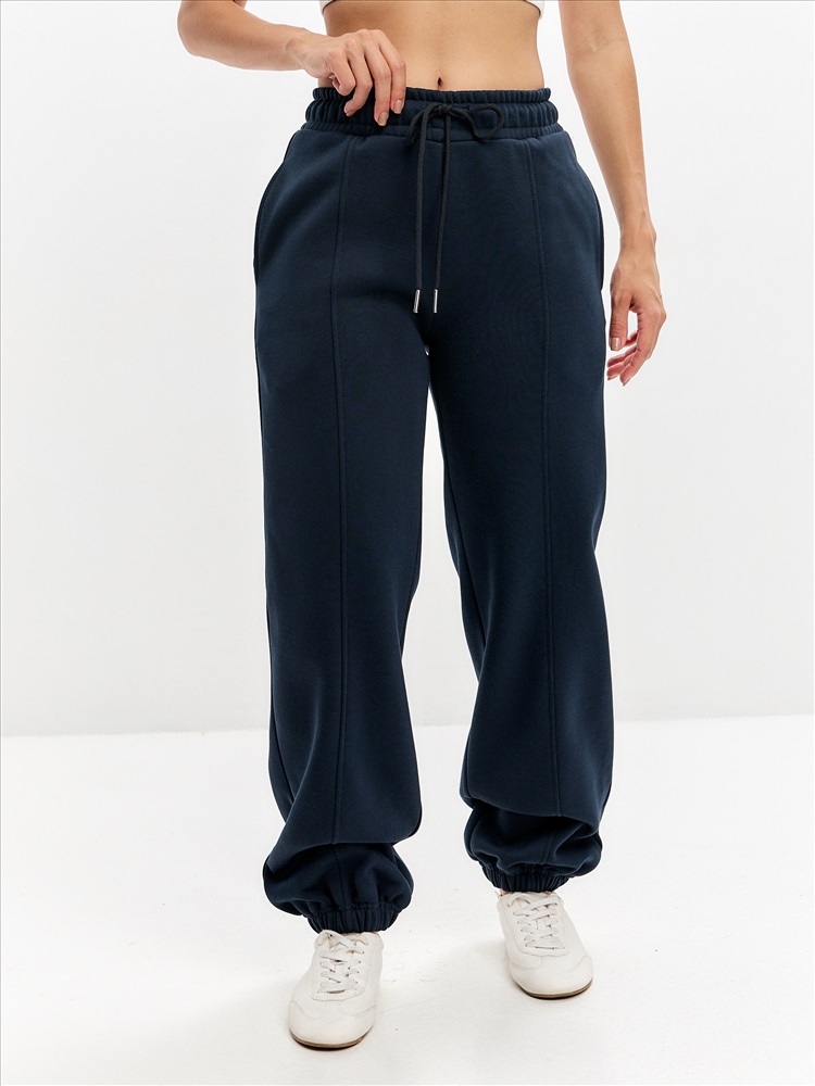 Состав ткани: 65% хлопок, 35% полиэстер Женские артикул 22L-RR-1873 темно-синего цвета брюки изготовлены из хлопкового трикотажного полотна с изнаночным начесом. Широкие брючины заужены книзу на эластичную тесьму. Строчка по передним половинкам, имитирующая стрелку, выгодно вытягивает силуэт брюк. Читать далее Удобные карманы выполнены в боковых швах. Пояс брюк широкий, по линии талии собран на эластичную резинку, длина пояса дополнительно регулируется шнуром. Комментарии к товару