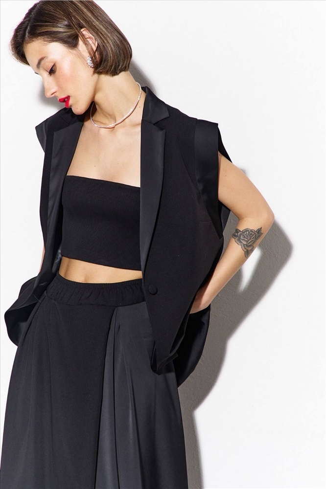 Комплект (жилетка и брюки): -жилетка свободного кроя, длиной ниже линии бедер -по талии спинки застрочены складки -воротник пиджачного -жилетка на подкладке -брюки широкие, длинные, на притачном поясе с резинкой - по верхнему срезу брюк заложены складки и выполнен запах по центру переда и спинки.