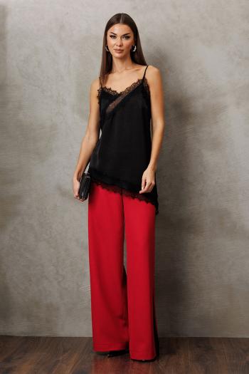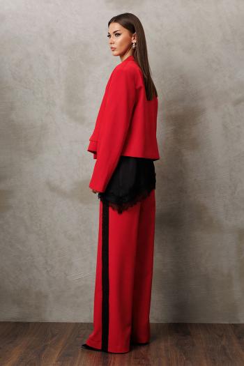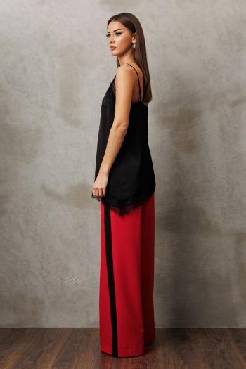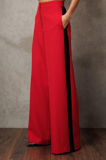 Брюки-палаццо из костюмной ткани с лампасом из пайеток. Брюки на притачном поясе и застежкой-гульфик. Пояс застегивается на петлю-пуговицу. По переду карман в шве притачивания к лампасу. По спинке пояс на резинке и вытачка от пояса. Комментарии к товару
