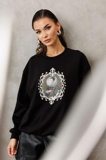 Джемпер из технологичного трикотажного полотна с эффектом peach. Прямого силуэта с втачным рукавом и спущенной линией плеча, с манжетой из отделочной ткани по низу рукава. По переду печать с вышивкой "Queen". По горловине и низу изделия притачная планка из отделочной ткани.