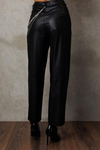 Брюки их эко-кожи заужены к низу. На притачном поясе со шлёвками, застежкой-гульфик. Пояс застегивается на петлю-пуговицу. По переду рельефы и карманами в них. По спинке вытачка от пояса. По переду и спинке брюки отрезные по лини колен. Комментарии к товару