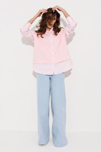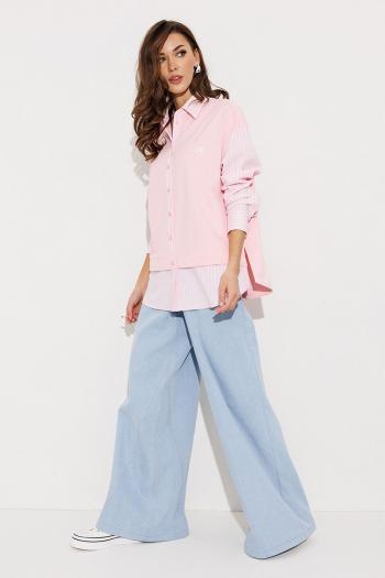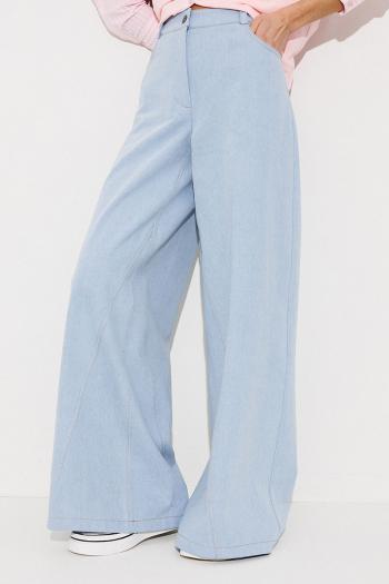 Брюки-джинсы, расклешенные к низу. На притачном поясе со шлёвками, застежкой-гульфик. Пояс застегивается на петлю-пуговицу. По переду карманы. Спинка с кокеткой и накладными карманами. По шаговому шву клин из основной ткани, переходящий на перед и спинку.
