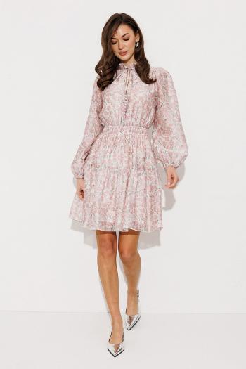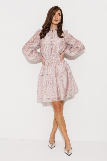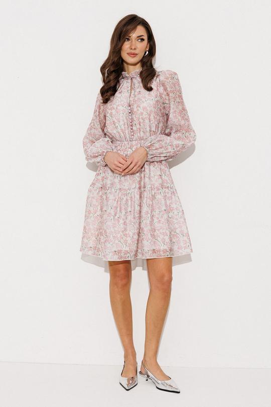 Платье полуприлегающего силуэта отрезное по линии талии, нижняя часть расширена, с воланом по низу. Платье с втачным рукавом со сборкой по окату и внизу на резинке. Лиф с V-образным вырезом и имитацией центральной застежкой на пуговицы. По спинке и переду вставка на талии с резинками. По горловине стойка с рюшей, которая завязывается по переду. Платье на подкладке.