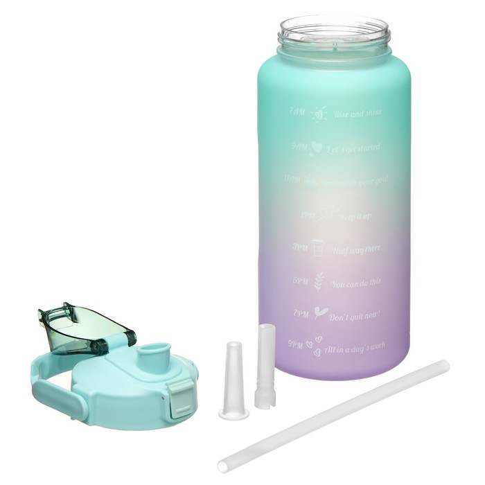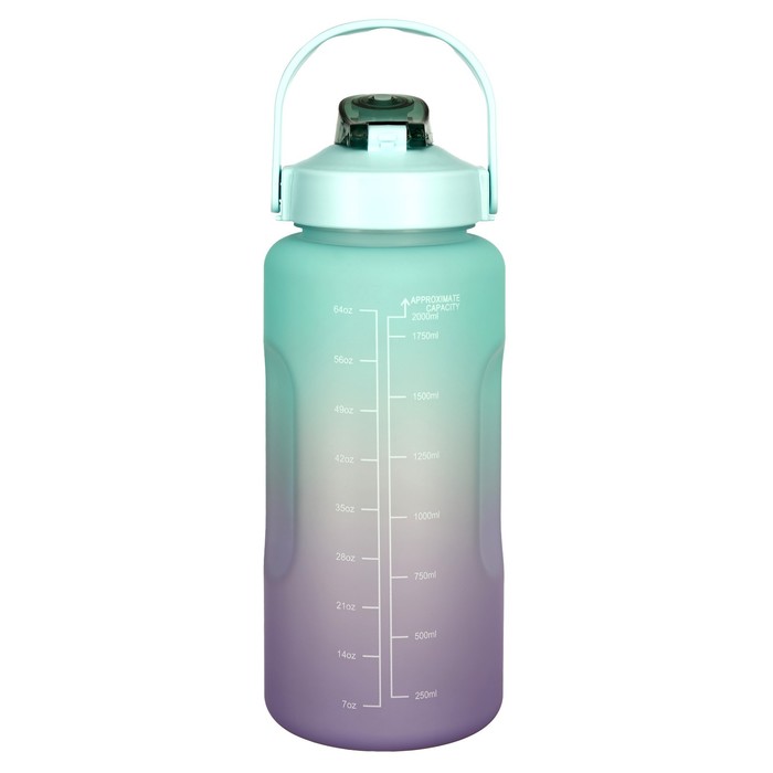 Габариты: 10,5 x 10,5 x 30; Страна: Китай; В боксе: 50 шт; Состав: Пластик; Материалы: пластик; Фасовка: по 1 шт; Индивидуальная упаковка: Пакет; Сертификат: СТР; Набор: Нет; Цвет: Сиреневый, Бирюзовый; Объём, мл: 2000; Рисунок: Да; Материал: Пластик; Вид: Бутылка; Можно мыть в посудомоечной машине: Нет; Особенности: На кнопке, С мерной шкалой, На подвесе, С трубочкой, С поильником