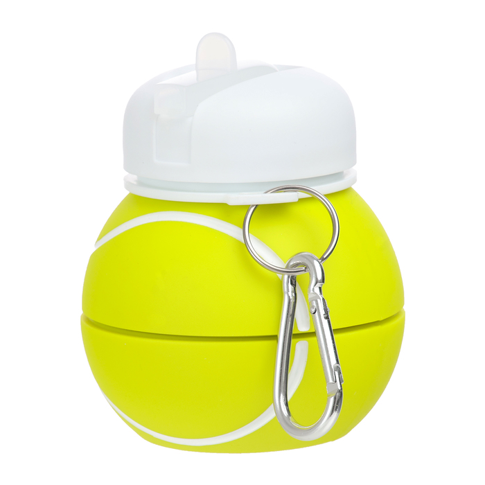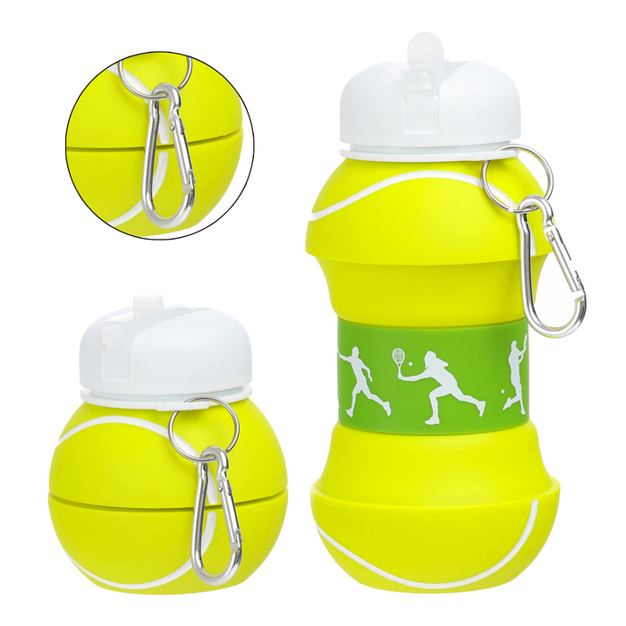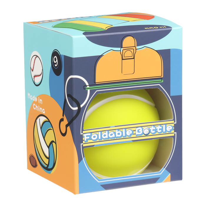 Габариты: 9 x 9 x 11; Страна: Китай; В боксе: 125 шт; Состав: Пластик, силикон; Материалы: пластик, силикон; Фасовка: по 1 шт; Индивидуальная упаковка: Картонная коробка; Сертификат: СТР; Набор: Нет; Цвет: Жёлтый; Объём, мл: 550; Рисунок: Да; Материал: Силикон; Вид спорта: Теннис, Универсальный; Вид: Бутылка; Можно мыть в посудомоечной машине: Нет; Особенности: Складная, С поильником, С креплением