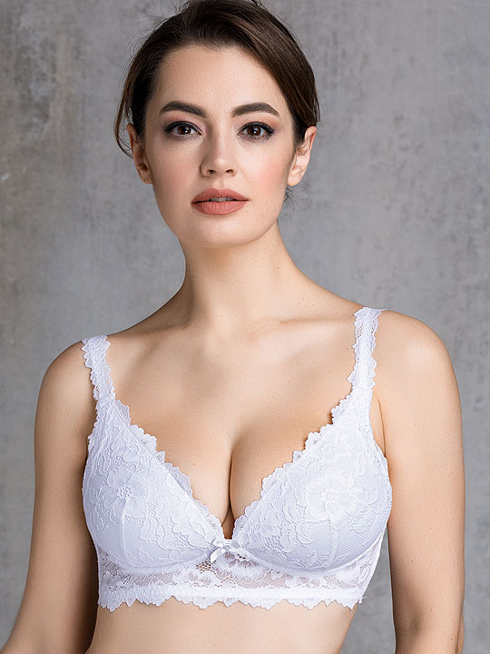 Бюстгальтер-триангул с формованной чашкой Trino, без костей, без эффекта пуш-ап. Кружевной стан усилен спереди сеткой и боковыми костями. Передняя часть бретелей декорированна узким кружевом. Выполнен из кружева. Застежка в 3 ряда на 3 позиции. Коллекция "Vivian".