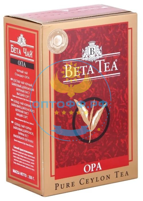 Чай ОПА растет на южных районах Шри-Ланки, на высоте 500м.над уровнем моря. Зеленые листочки собирают и доводят до темного цвета, такая специфическая обработка дает чаю красивый цвет и тонизирующий эффект. Бета ОПА одинаково вкусен как в горячем так и в холодном виде, он считается одним из самых утонченных сортов цейлонского чая серии ORANGE PEKOE.