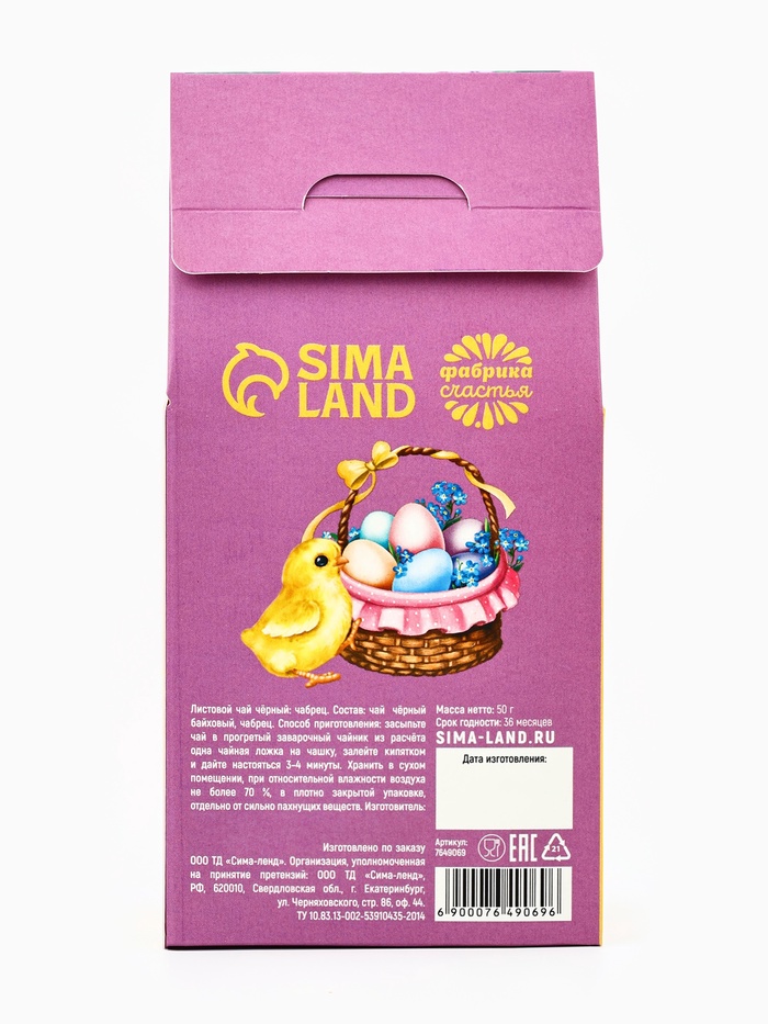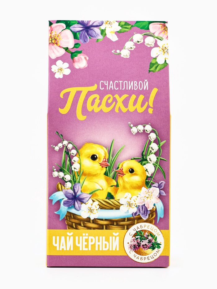 Производитель: Фабрика счастья; Габариты: 5,5 x 8,3 x 16; Страна: Россия; В боксе: 64 шт; Состав: См. на упаковке; Материалы: см. на упаковке; Фасовка: по 1 шт; Индивидуальная упаковка: Термоусадочная пленка; Сертификат: ЕАС; Набор: Нет; Вес нетто, г: 50; Фасовка: Весовой; Вид чая: Чёрный; Тематика праздника: Пасха; Вкус: Чабрец; Подарочный чай: Да; Добавки чая: Чабрец; Вид упаковки: В пакете