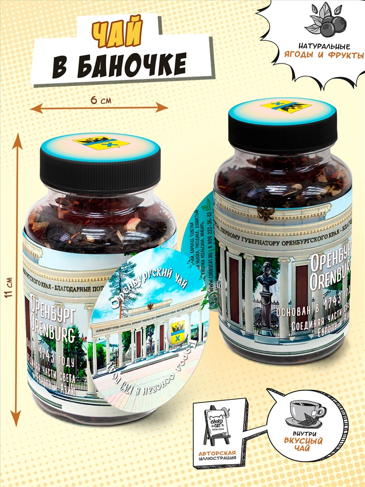 Чай из солнечного Оренбурга для Вас и Ваших близких! Туристический чай в баночке – памятный подарок из мест отпуска и поездок, напоминающий о достопримечательностях городов, сохраняющий в себе воспоминания путешествий и дарящий яркий аромат и вкус настоящего чая. Комментарии к товару