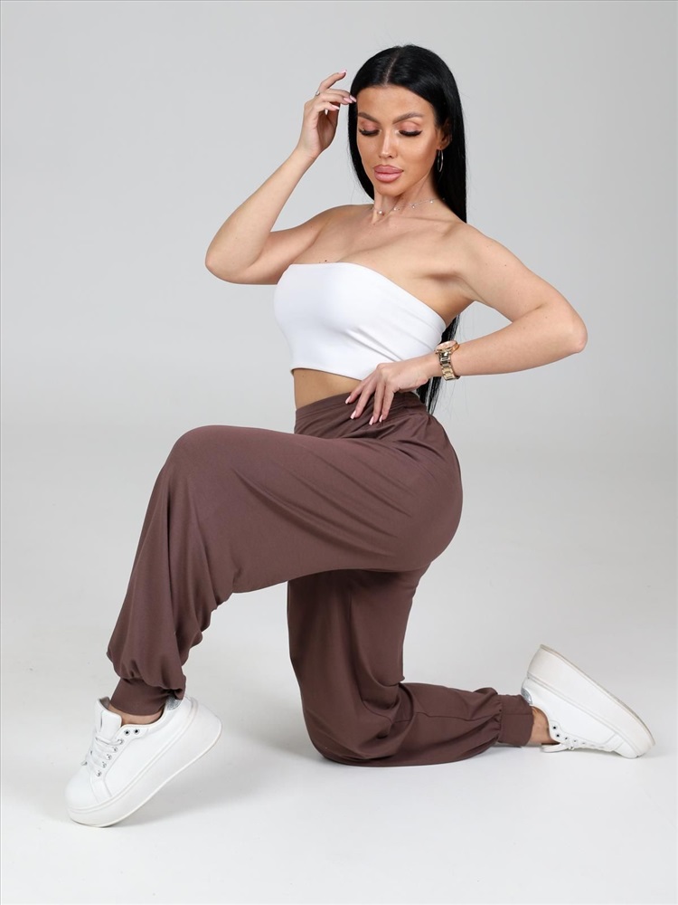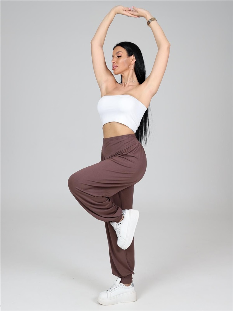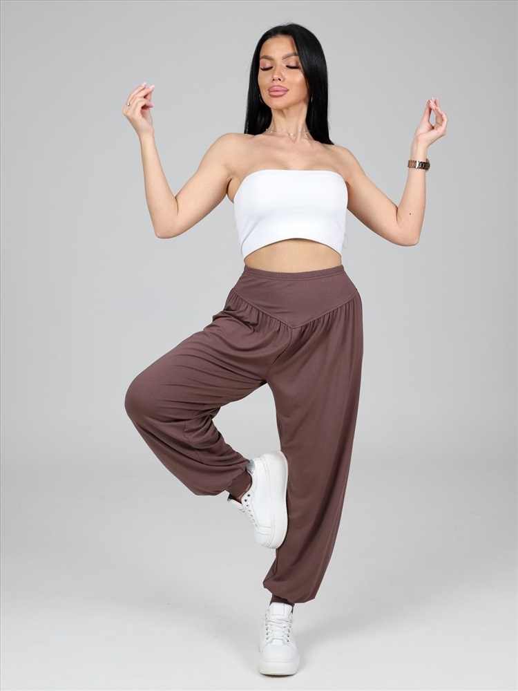 цвет: капучино Материал: Вискоза Трикотаж - Вискоза (Вискоза 95%; Лайкра 5%). Женские брюки-шаровары выполнены из трикотажного полотна "вискоза". Широкие брюки, присборенные сверху на поясе-кокетке фигурной формы, внутри которого прикреплена эластичная лента и внизу на высокие манжеты. Комментарии к товару