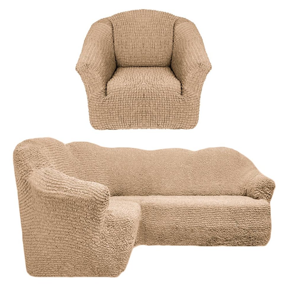Чехол на угловой диван без юбки с креслом светло бежевый