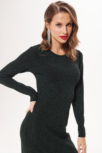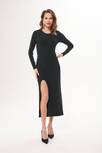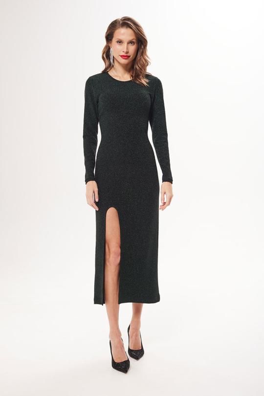 Платье женское, приталенного силуэта, выполнено из эластичного трикотажа с металлизированной нитью. Горловина округлой формы. Рукав втачной одношовны. По переду платья фигурный высокий разрез. Данная модель платья - идеальное дополнение к гардеробу современной девушки.