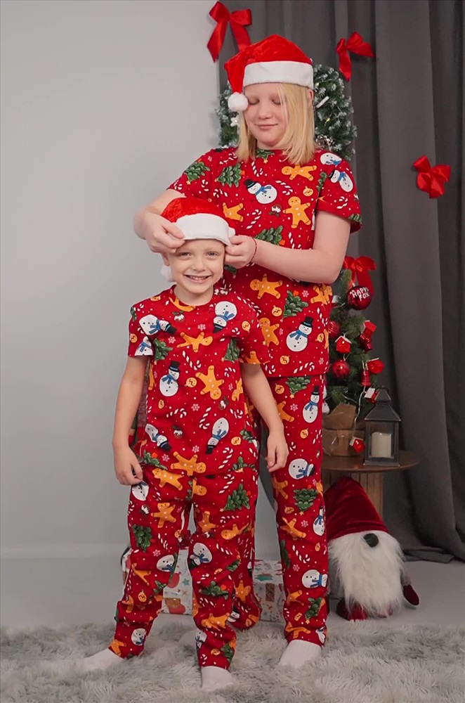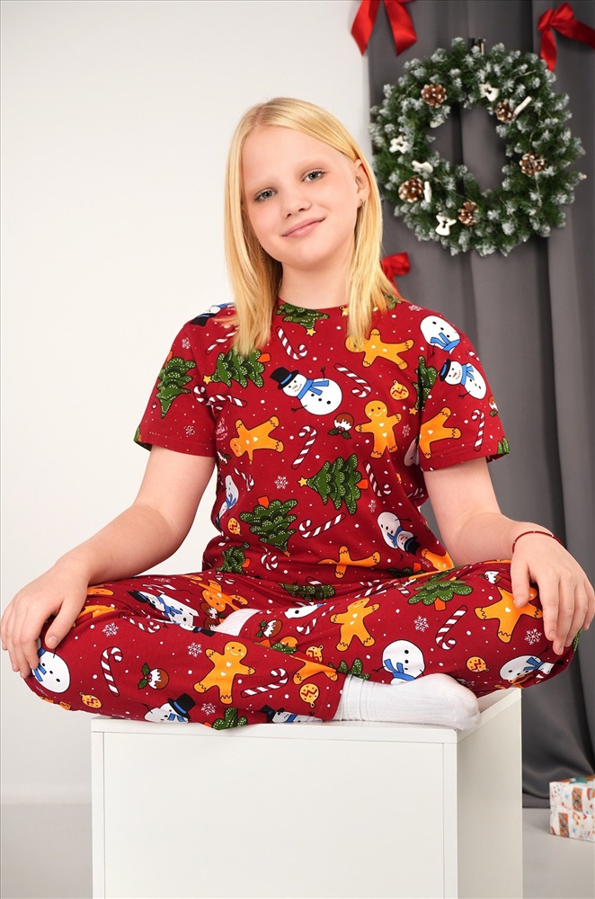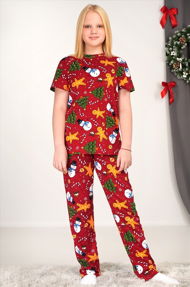 Преимущества: — хлопковая трикотажная ткань кулирная гладь приятна к телу и отлично пропускает воздух; — пижама не боится частых стирок и надолго сохраняет яркость; — свободный крой не сковывает движений и позволяет детям и подросткам оставаться активными; — мягкая резинка на поясе дарит удобную посадку; — новогодний рисунок делает комплект по-настоящему особенным. В набор входит футболка с коротким рукавом и штаны, которые идеально подойдут для сна и отдыха дома. Хлопковая пижамка подарит уют ребенку и станет отличным вариантом для фэмили лук (family look).