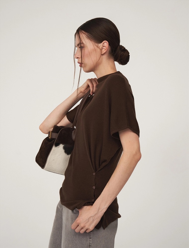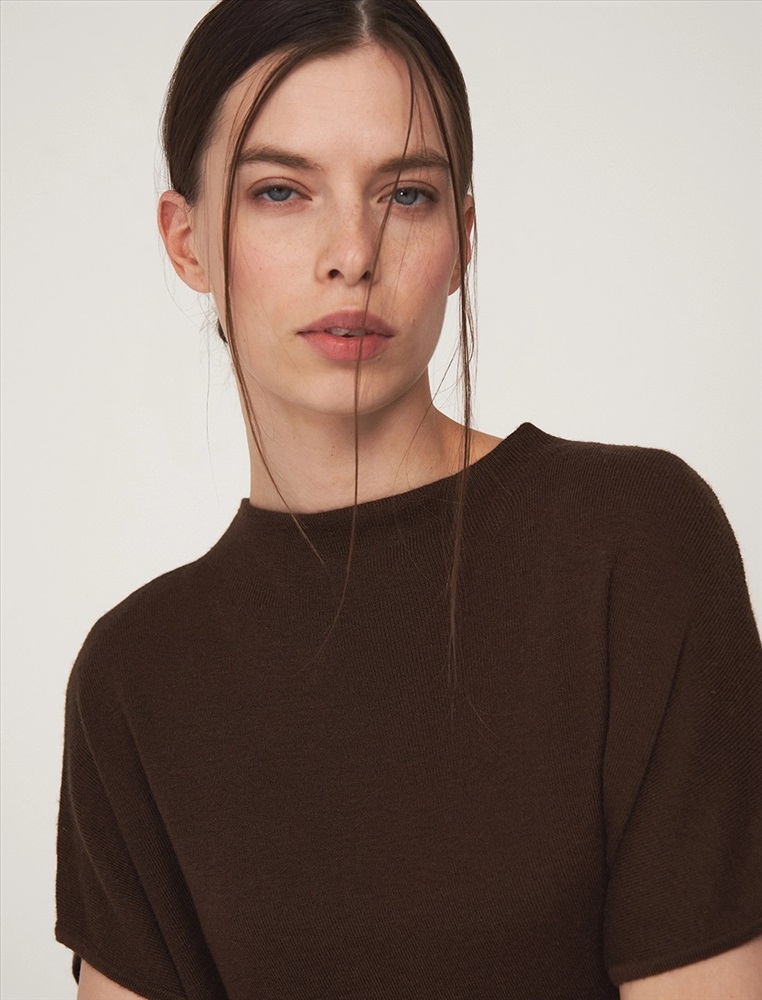 Вязаный джемпер регулярного силуэта с коротким цельнокроенным рукавом и воротником-стойкой. По передней части, снизу, с левой стороны – застежка на пуговицы для приталивания силуэта. Выполнен из хлопка и акрила с добавлением кашемира и шелка, что обеспечивает комфорт и тепло. Представлен в сером и коричневом оттенке.