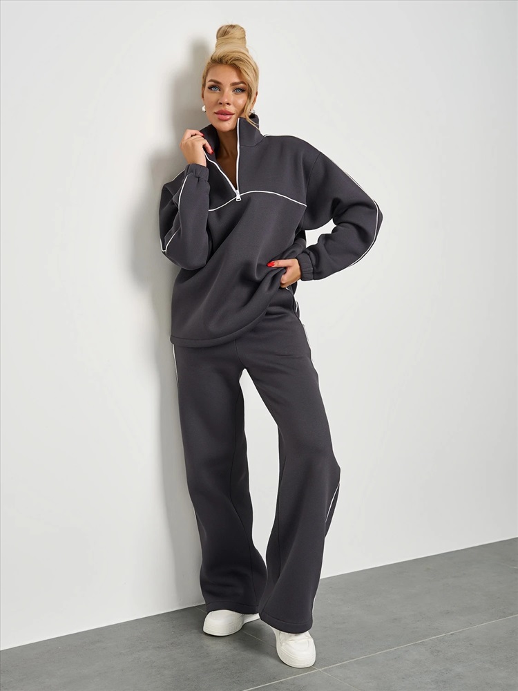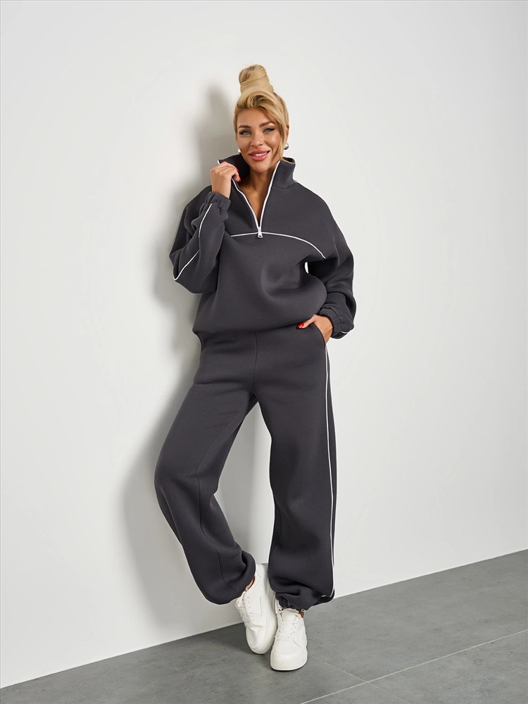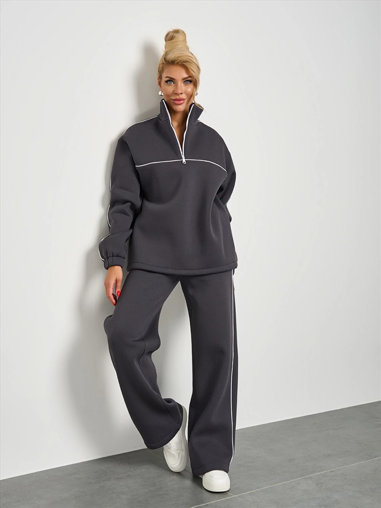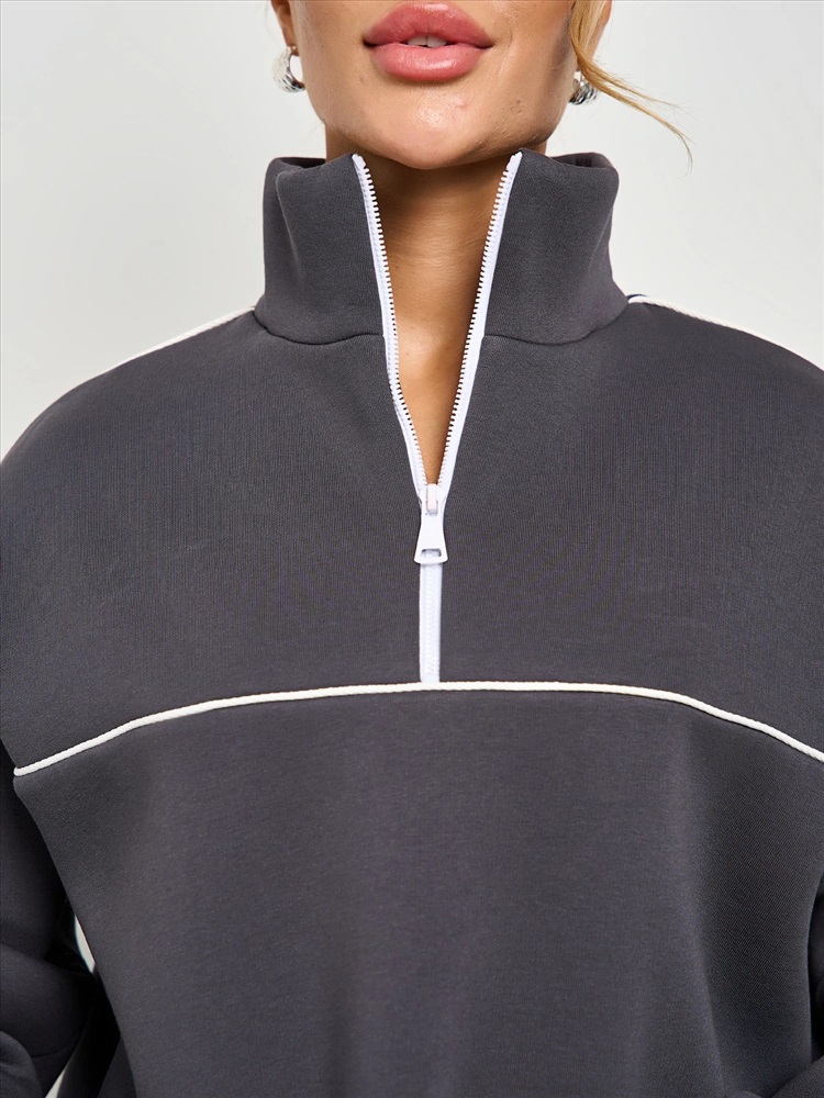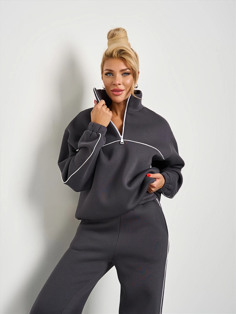 По переду изделия и вдоль рукава выполнена отделка декоративным контрастным кантом. Линия плеча спущенная. Длинный рукав на манжете и резинкой внутри манжета. Воротник - стойка на молнии. По низу иделия вставлена резинка с регулятором объема. В комплект вы можете приобрести брюки арт. 173-4. Комментарии к товару