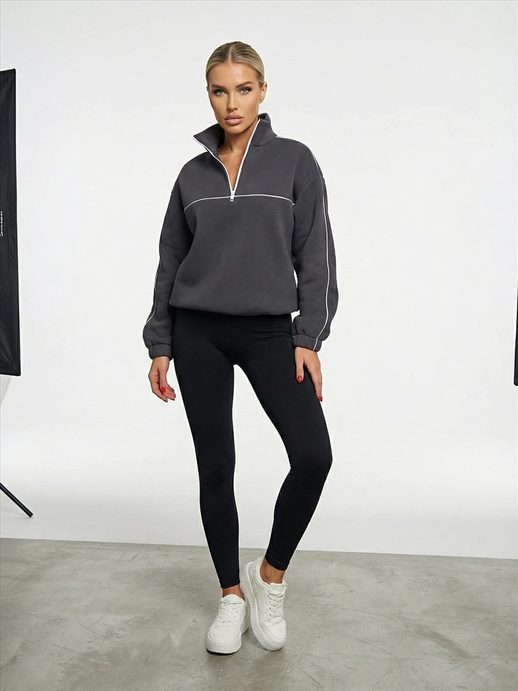 По переду изделия и вдоль рукава выполнена отделка декоративным контрастным кантом. Линия плеча спущенная. Длинный рукав на манжете и резинкой внутри манжета. Воротник - стойка на молнии. По низу иделия вставлена резинка с регулятором объема. В комплект вы можете приобрести брюки арт. 173-4. Комментарии к товару