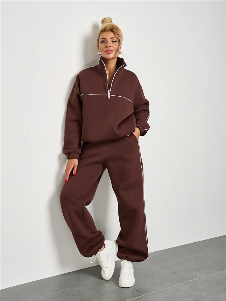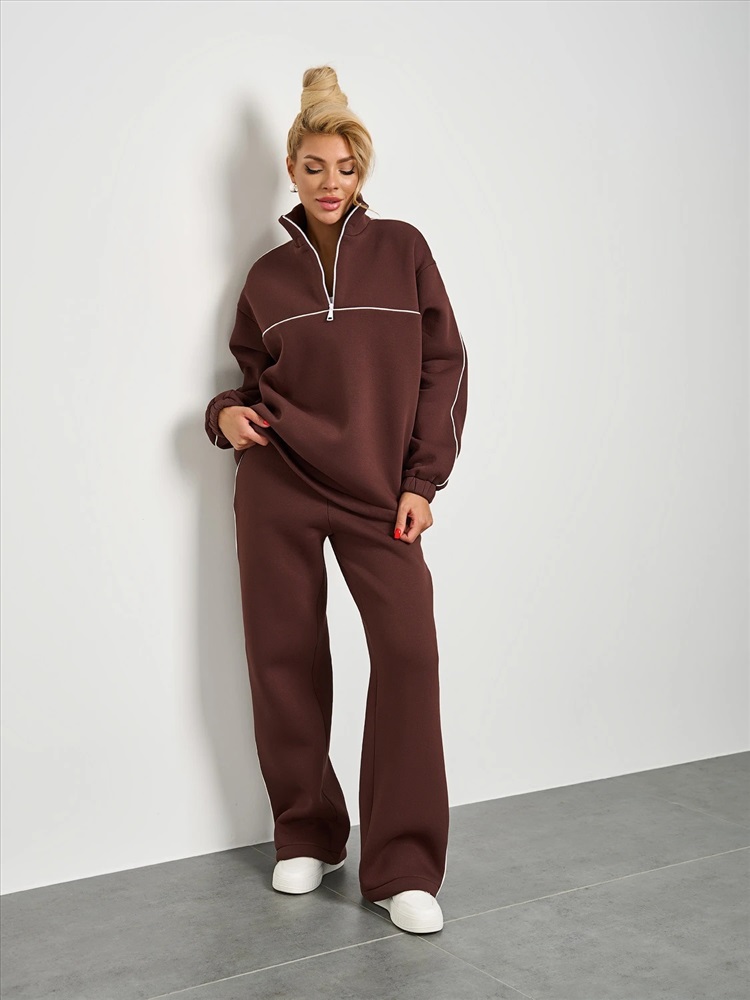 По переду изделия и вдоль рукава выполнена отделка декоративным контрастным кантом. Линия плеча спущенная. Длинный рукав на манжете и резинкой внутри манжета. Воротник - стойка на молнии. По низу иделия вставлена резинка с регулятором объема. В комплект вы можете приобрести брюки арт. 173-5. Комментарии к товару