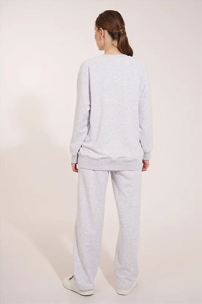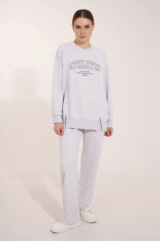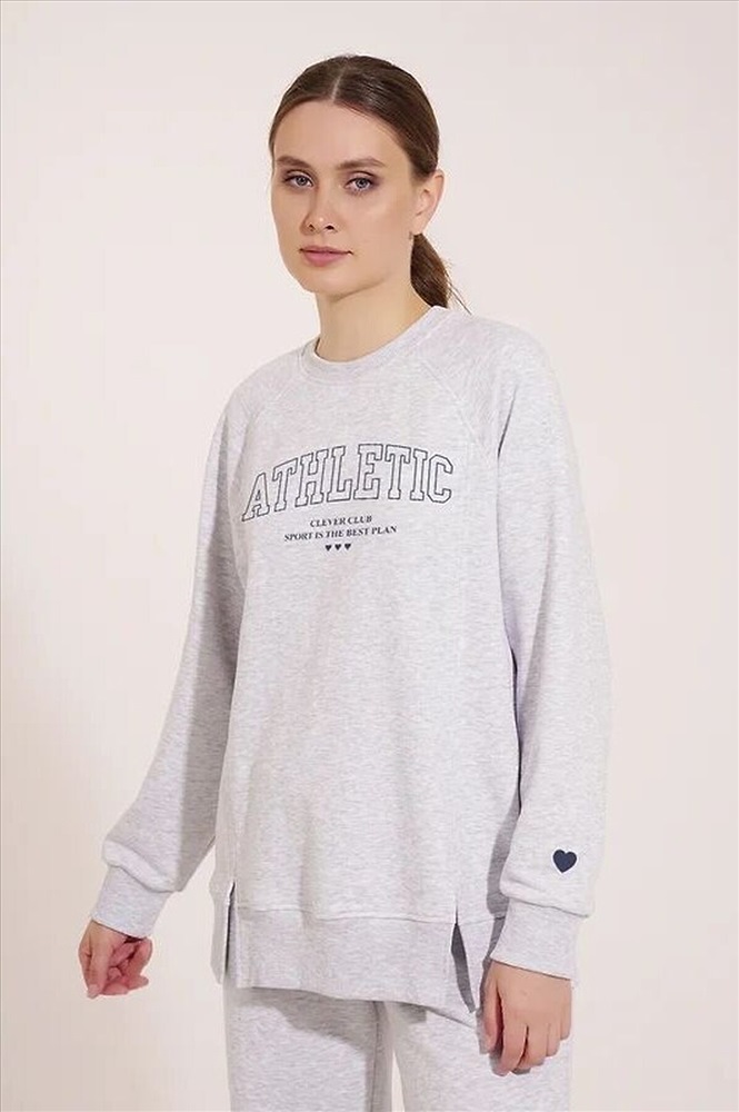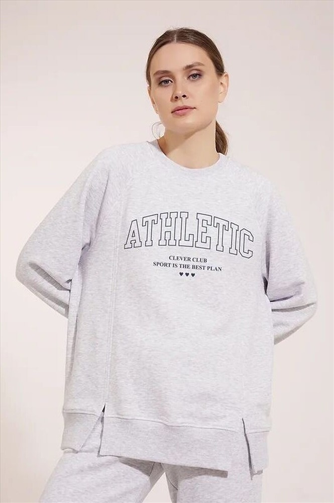 Джемпер спортивный из трикотажного полотна футер, свободного кроя. Округлая горловина с обтачкой. По переду резы с разрезами. Длинный рукав реглан, внизу нашивка. По низу рукава и изделия манжеты. Спереди принт. Состав: 57% Полиэстер, 43% Хлопок
