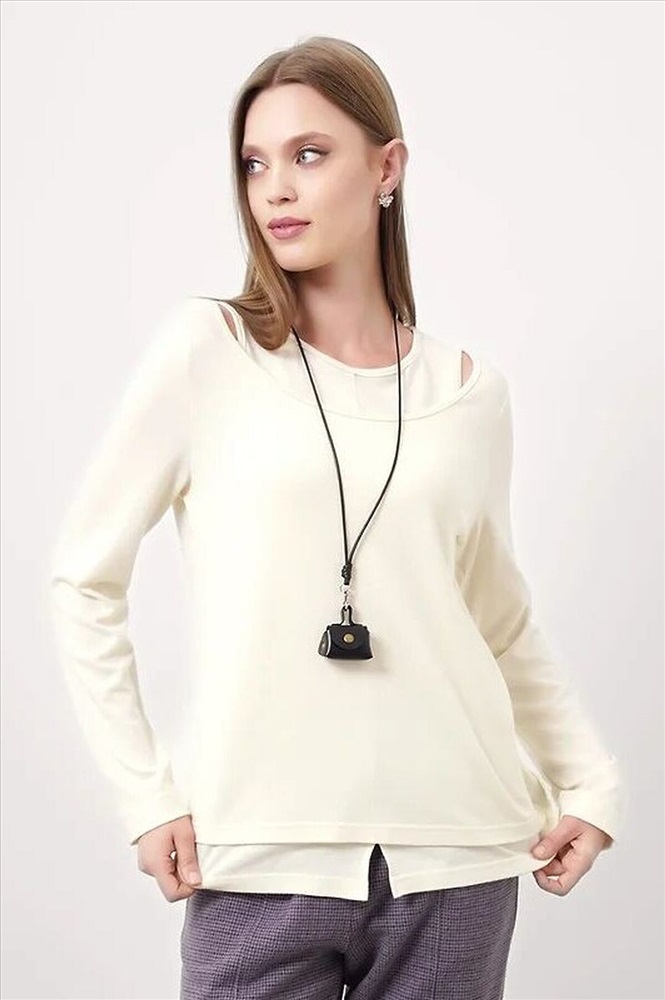 Джемпер из трикотажного полотна вискоза вязанная. Округлая горловина с окантовкой. Втачной длинный рукав. Перед двойной (нижний слой со средним швом и разрезом внизу).