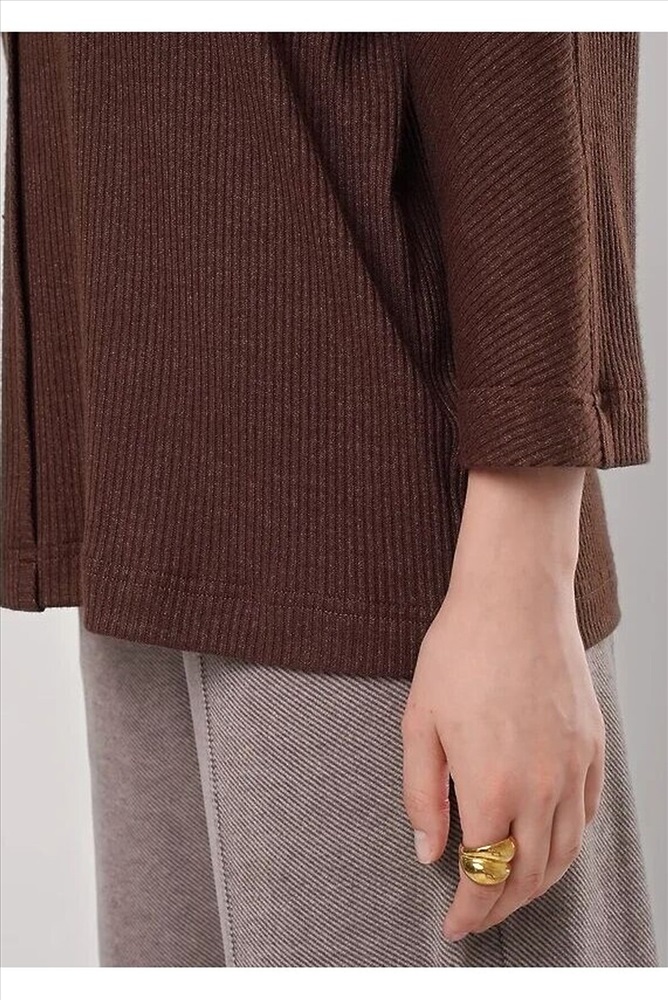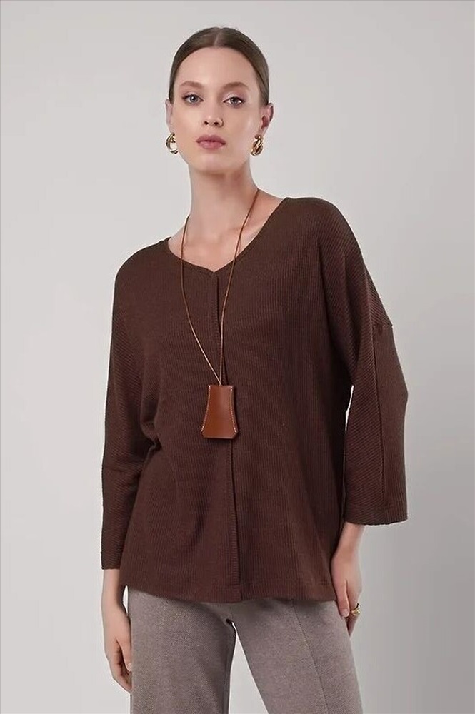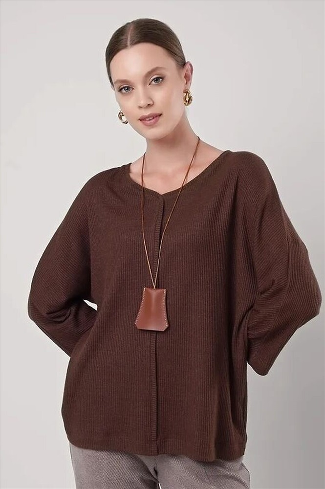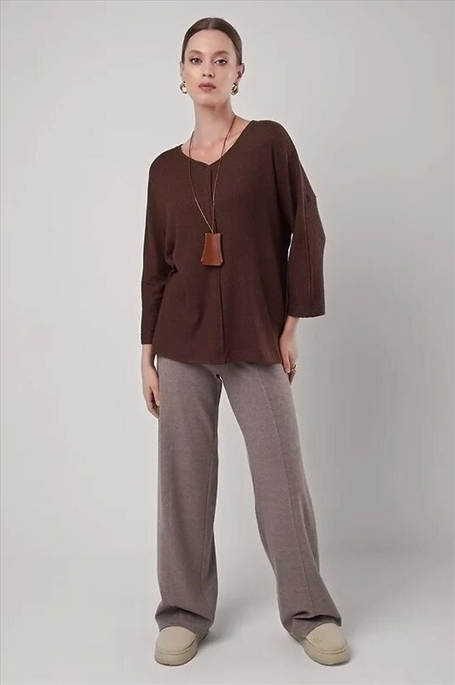 Джемпер свободного кроя из трикотажного полотна кашкорсе. По горловине притачная обтачка, переходящая на перед. Длинный цельнокроенный рукав спереди, по спинке спущенный. По переду и спинке средний шов.