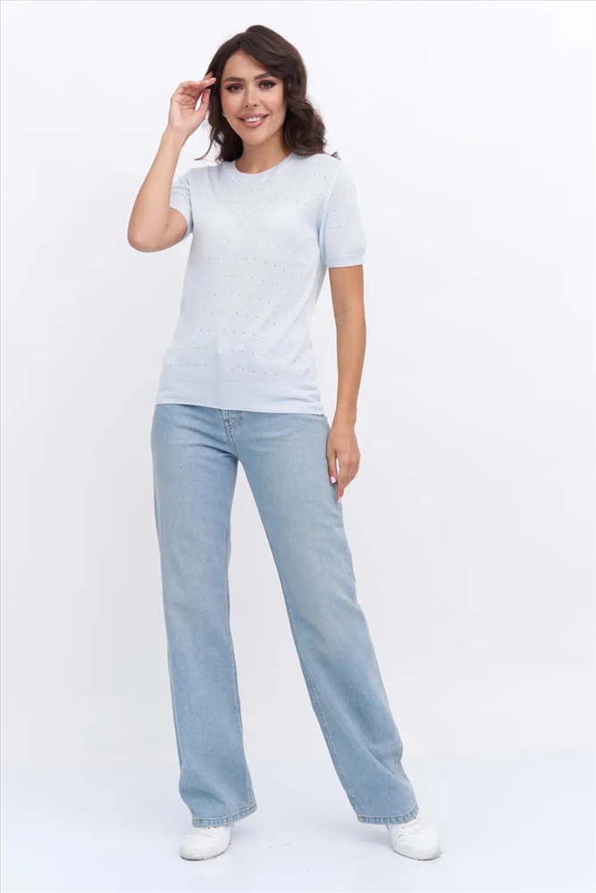 Легкий трикотажный джемпер с коротким втачным рукавом. Выполнен из пряжи, в составе которой 50% хлопка, что позволяет носить его как летом, так и весной и осенью. Круглая горловина и короткий рукав делают наш джемпер легким и легко сочетаемым с кофточками или кардиганами.