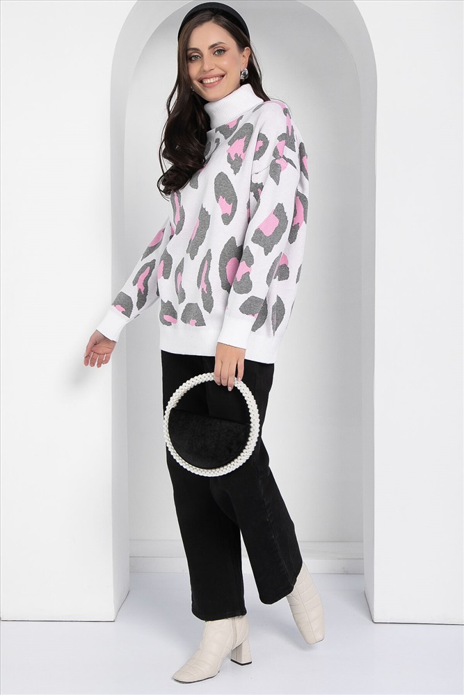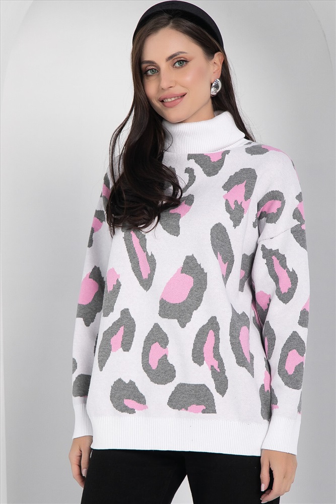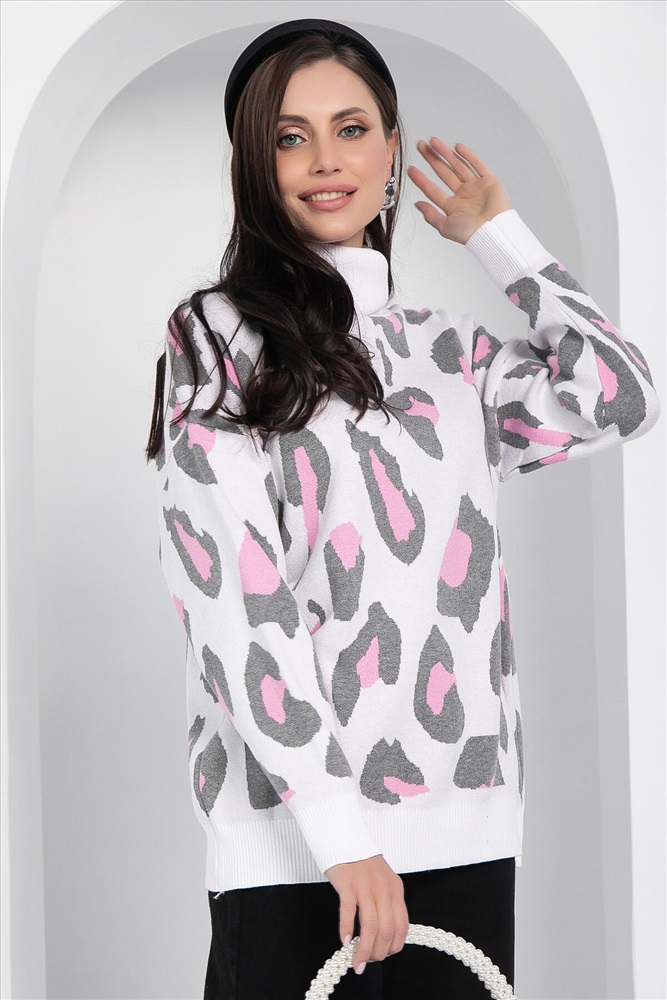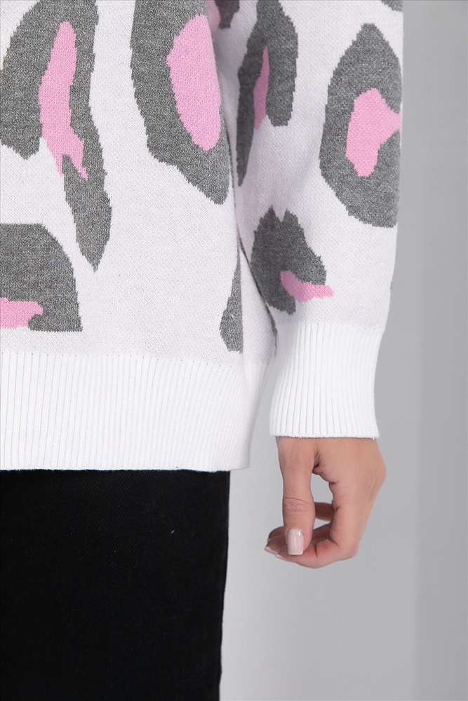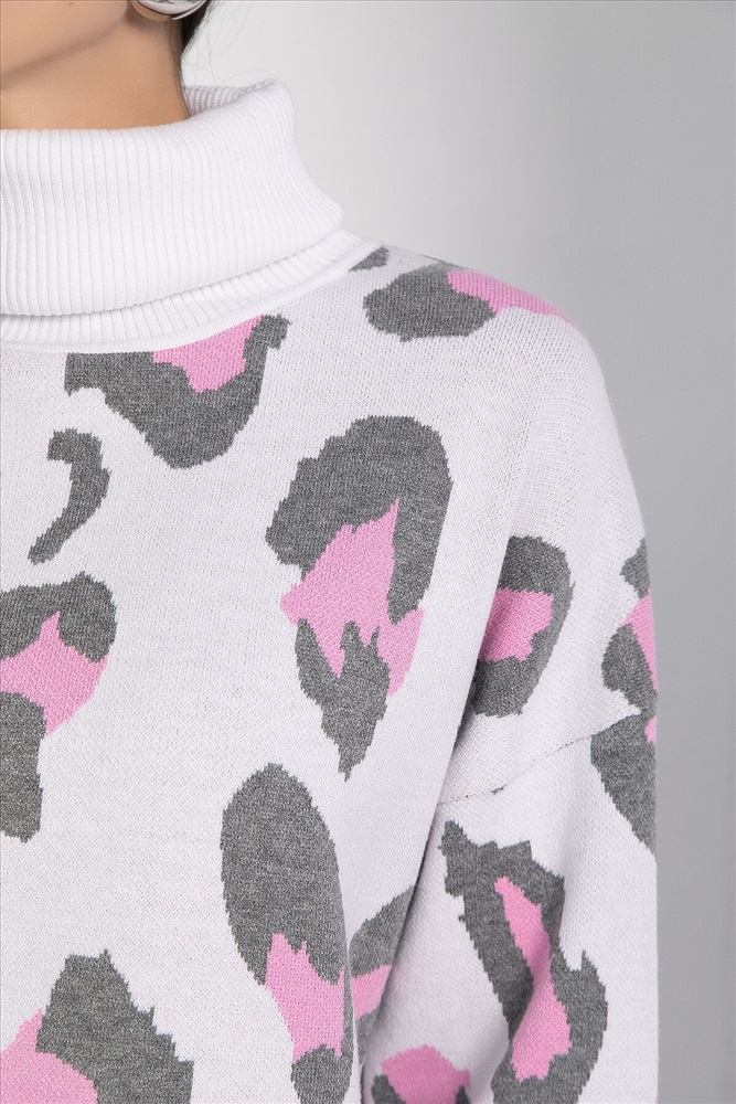 Тип ткани: смесовая. Состав: 70% хлопок, 20% кашемир, 10% спандекс. Материал: трикотаж. Цвет: бело-розовый. Принт: леопард. Вид застежки: без застёжки. Силуэт: прямой. Карманы: отсутствуют. Подкладка: отсутствует. Декоративные элементы: отсутствуют. Длина по спинке от верхней точки плеча: ONE SIZE (44-52) - 64 см. Рост модели: 168 см. Джемпер прямого кроя с длинными рукавами — воплощение комфорта и тепла. Он мягкий и приятный на ощупь, что делает его идеальным выбором для повседневной носки. Свободный крой и спущенная линия плеча создают ощущение простора и свободы движений. Вы будете чувствовать себя комфортно в любой ситуации. Высокий ворот-хомут не только добавляет стильный акцент, но и надёжно защищает от холода. Леопардовый принт придаёт дерзости и оригинальности. Наденьте этот джемпер и наслаждайтесь его уютом! Уход за изделием: ручная стирка до 30 градусов; нельзя отбеливать; отжим запрещён; гладить при t не более 110 С; гладить с изнанки. Внимание! Рекомендуем ориентироваться на размерную сетку и выбирать свой привычный размер, согласно размерной таблице. *Допуск отклонения длины при массовом производстве 1-3 см является нормой. Комментарии к товару