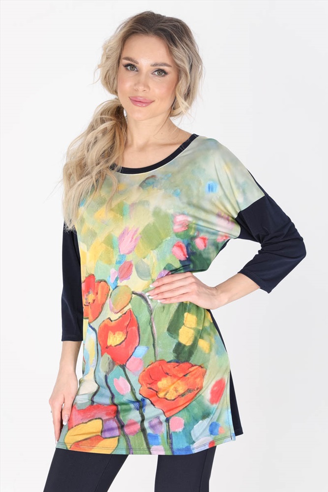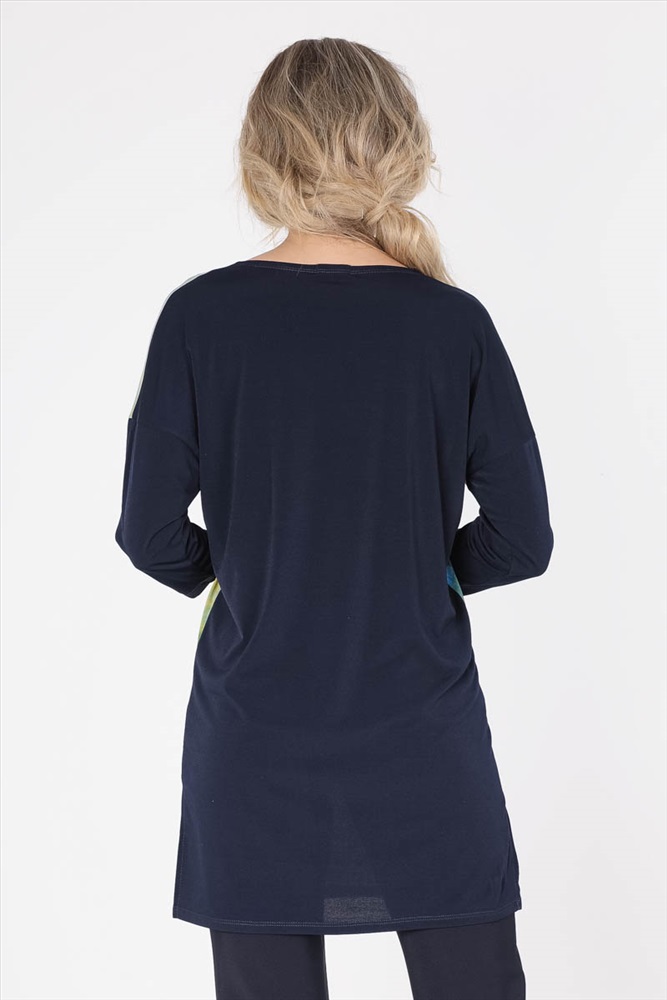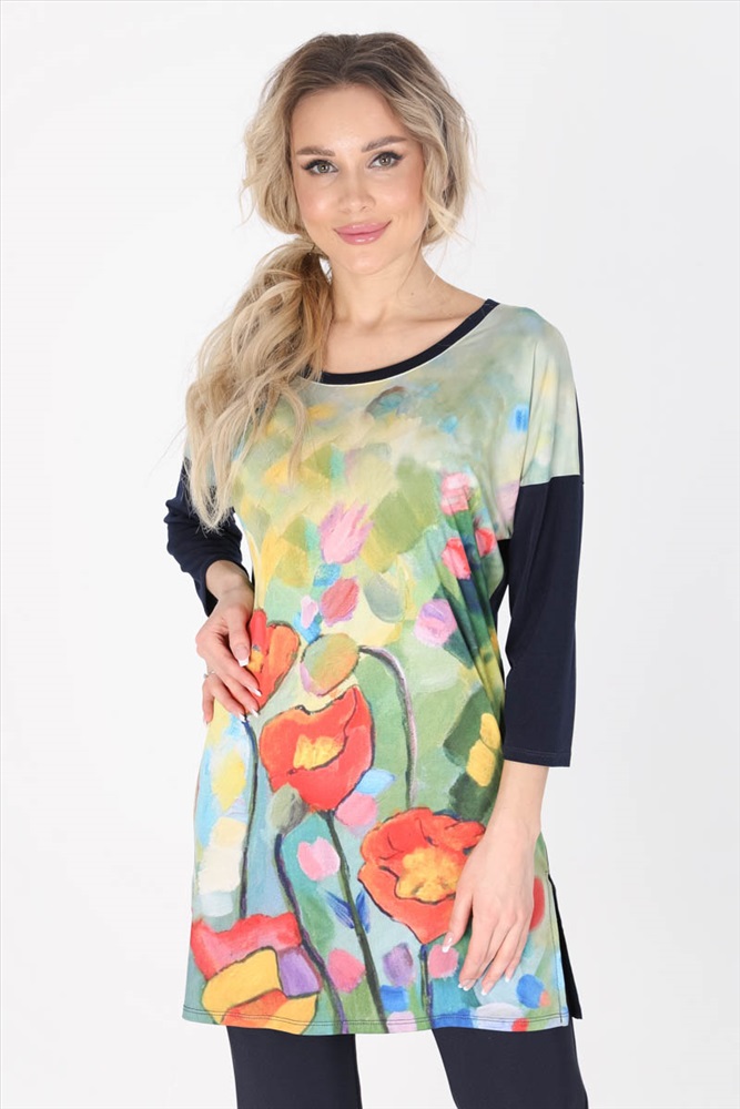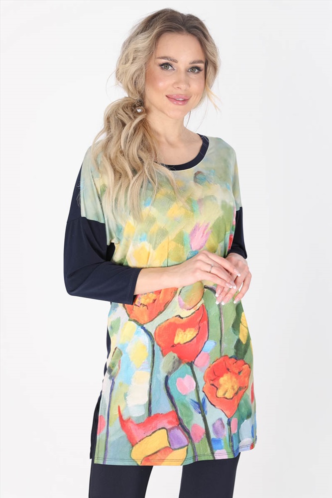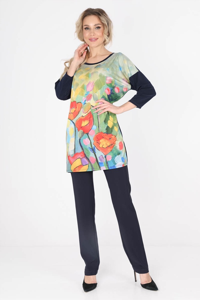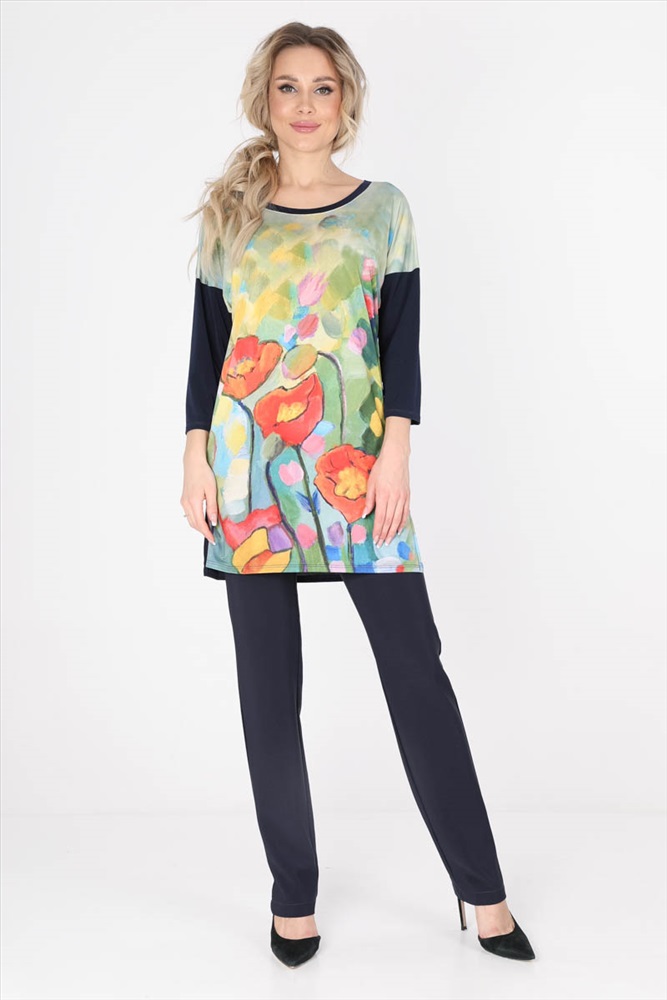 Повседневный джемпер свободного силуэта из трикотажного полотна синего цвета с акварельным рисунком. Круглый вырез изделия обработан внутренней обтачкой. Изделие с втачными рукавами, со спущенной линией проймы и длиной три четверти. В боковых швах изделия разрезы.