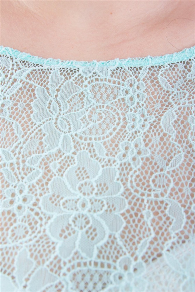 Обворожительный джемпер полуприлегающего силуэта из трикотажного кружевного полотна зеленого цвета. Горловина изделия и втачные рукава обработаны внутренней атласной бейкой.
