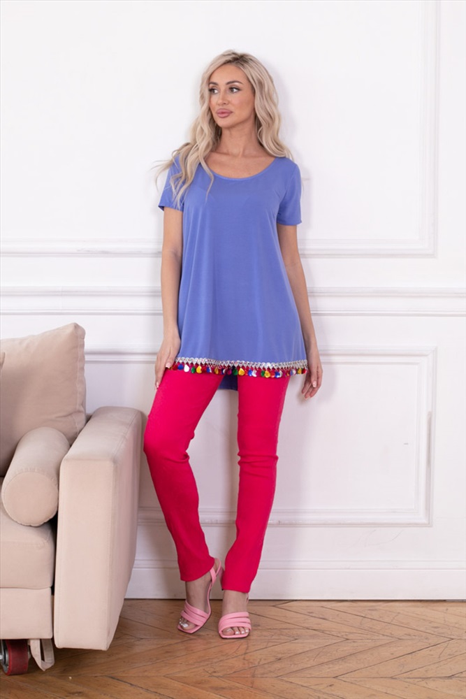 Очаровательный джемпер свободного силуэта из трикотажного полотна сиреневого цвета. Круглый вырез изделия обработан внутренней бейкой. Джемпер с втачными рукавами. Низ изделия по переду украшен декоративной тесьмой.